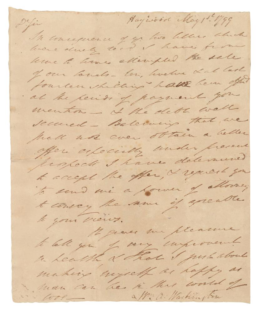 Officer of the Continental Army during the American Revolutionary War (1752-1810) and second cousin to President George Washington. ALS signed “Wm. A. Washington,” one page, 6.5 x 8.25, May 1, 1799. Handwritten letter to William Russell, in part: “In consequence of yr two letters which were duly rec’d I have from time to time attempted the sale of our land—ten?& at last fourteen shillings have been offer’d at the periods of payment you mention—& the debut well secured—Believing that we shall not ever obtain a better offer especially under present prospects I have determined to accept the offer, & request you to send me a power of attorney to convey the same of agreeable to your views.” In fine condition, with trimmed edges.