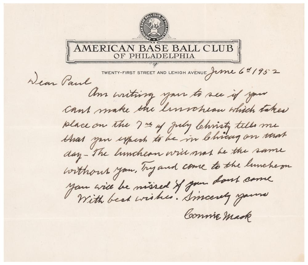 ALS, one page, 8.5 x 7.25, American Base Ball Club of Philadelphia letterhead, June 6, 1952. Boldly penned handwritten letter to "Paul," in full: "Am writing you to see if you can't make the luncheon which takes place on the 7th of July. Christy tells me that you expect to be in Chicago on that day. The luncheon will not be the same without you. Try and come to the luncheon you will be missed if you can't come." In fine condition, with intersecting folds and two light paperclip impressions to the top edge.