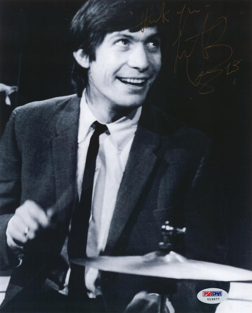 Satin-finish 8 x 10 photo of the Rolling Stones drummer smiling behind his kit, signed in gold ink by Charlie Watts, who adds the year, "13." In very fine condition, with a PSA/DNA label affixed to the lower right corner. Accompanied by a certificate of authenticity from PSA/DNA.