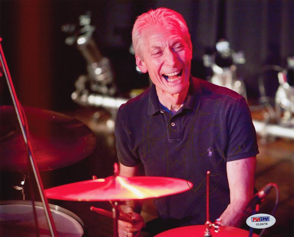 Color satin-finish 10 x 8 photo of the Rolling Stones drummer laughing behind his kit, signed in gold ink by Charlie Watts, who adds the year, "13." In fine condition, with a PSA/DNA label affixed to the lower right corner. Accompanied by a certificate of authenticity from PSA/DNA.
