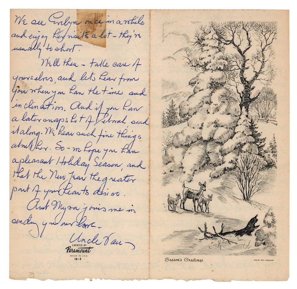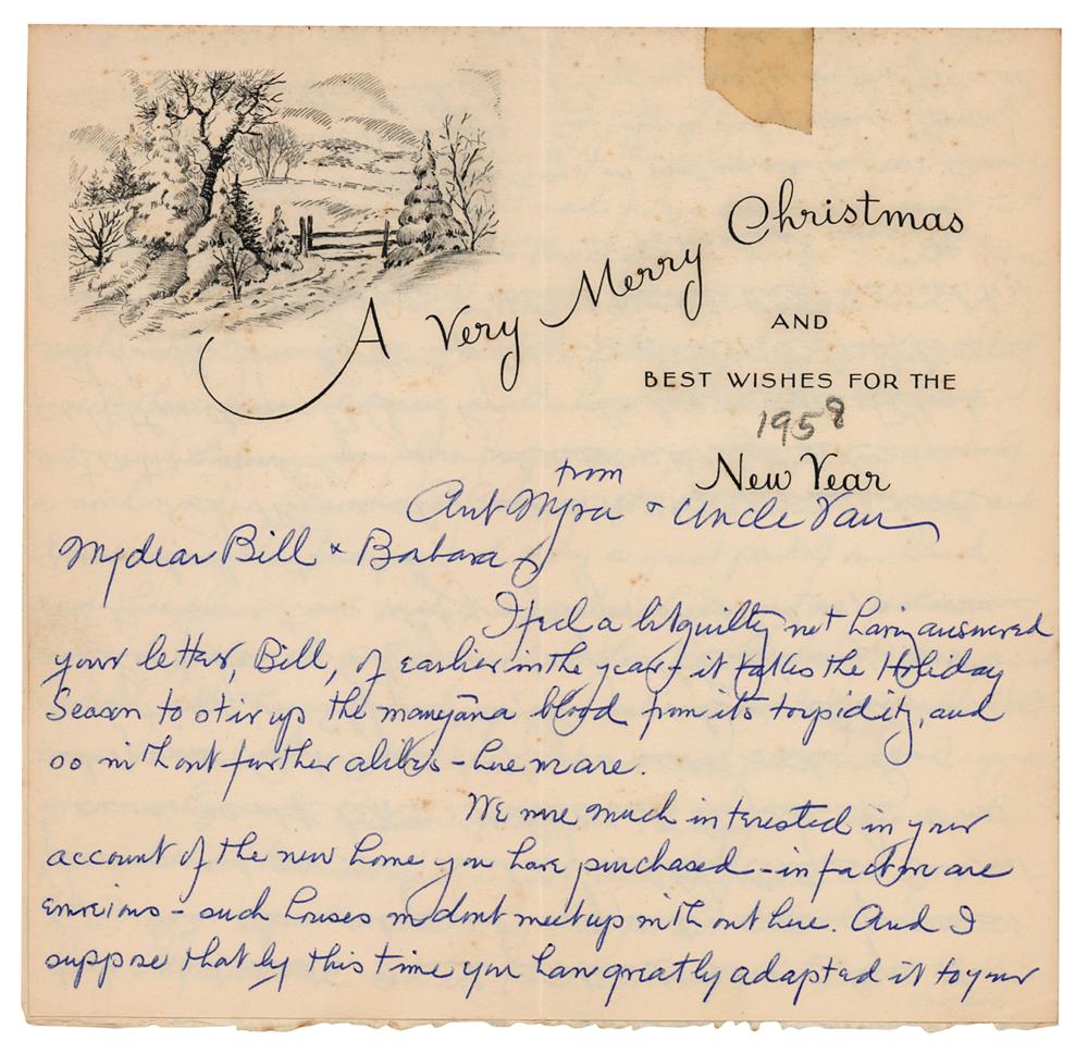 American character actor (1882-1964) best remembered for his roles in the Universal Studios horror films such as Dracula (1931), Frankenstein (1931), and The Mummy (1932). Rare ALS signed "Uncle Van," penned on both sides of an unfolded 7.25 x 14 Christmas card, annotated 1958 in pencil. Handwritten letter to his nephew Bill and his wife Barbara, in part: "We were much interested in your account of the new home you have purchased?And I suppose that by this time you have greatly adapted it to your tastes and needs. I said 'purchased' since I hope that by this time the rental period is up, and you are in permanent possession, and can reconstruct to your liking?It all sounds too fascinating to me; and of course Aunt Myra's teeth grew visibly reading your description of it. She you know, has never become a Californian and her tastes are not squared up with Californian tastes. Let's hear sometime what your progress with it is?