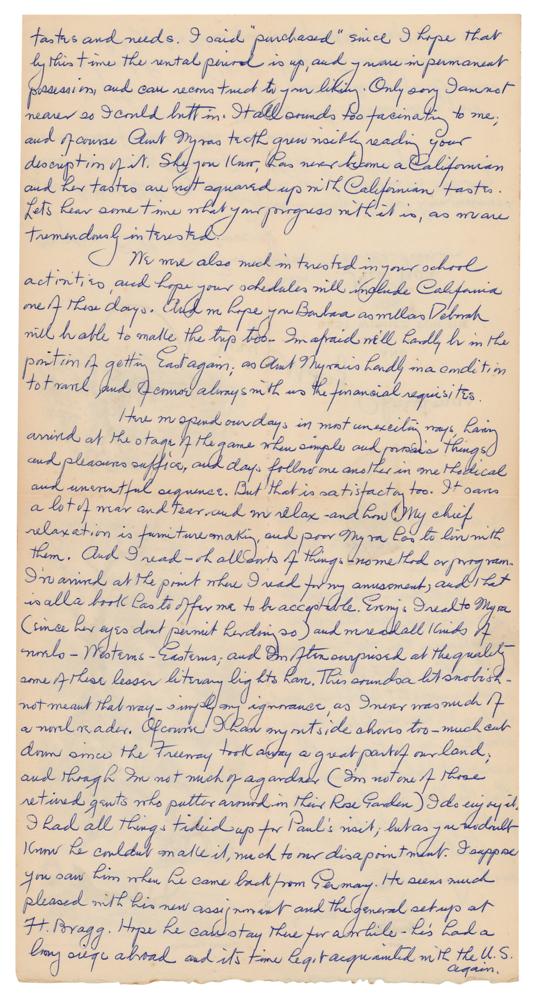 Here we spend our days in most unexciting ways, having arrived at the stage of the game when simple and prosaic things and pleasures suffice, and days follow one another in methodical and uneventful sequence. But that is satisfactory too?My chief relaxation is furniture making, and poor Myra has to live with them. And I read—oh all sorts of things—no method or program?all kinds of novels—Westerns—Easterns; and I'm often surprised at the quality some of these lesser literary lights have. This sounds a bit snobbish—not meant that way—simply my ignorance, as I never was much of a novel reader." In fine condition, with a piece of old tape to the top edge.