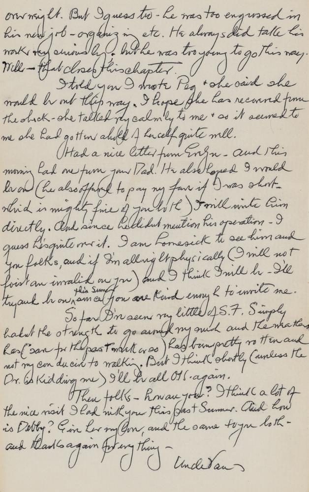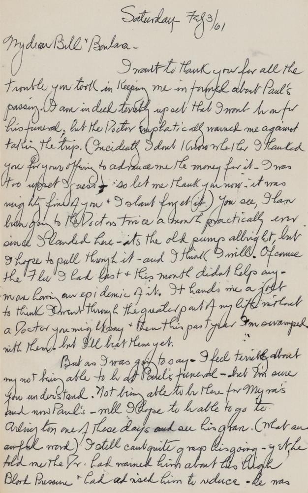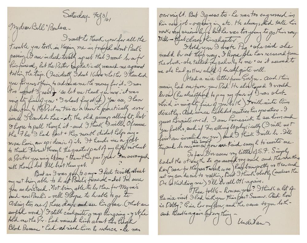 American character actor (1882-1964) best remembered for his roles in the Universal Studios horror films such as Dracula (1931), Frankenstein (1931), and The Mummy (1932). ALS signed “Uncle Van,” two pages, 6.25 x 10, February 3, 1961. Handwritten letter to his nephew Bill and his wife Barbara, in part: "I want to thank you for all the trouble you took in keeping me informed about Paul's passing. I am indeed terribly upset that I won't be on for his funeral, but the Doctor emphatically warned me against taking the trip?I have been going to the Doctors twice a month practically ever since I landed here—it's the old pump allright, but I hope to pull through it—and I think I will. Of course the flu I had last & this month didn't help any—we are having an epidemic of it?I still can't quite grasp his going—yet he told me the Dr. had named him about his high blood pressure & had asked him to reduce—he was overweight. But I guess too—he was too engrossed in his new job—organizing etc. He always did take his work very seriously, but he was too young to go this way." In fine condition.