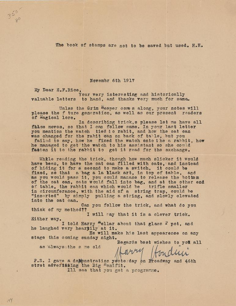 TLS, one page, 8.5 x 11, November 6, 1917. Letter to E. F. Rice, in part (spelling corrected): "Unless the Grim Reaper comes along, your notes will please the future generation, as well as our present readers of magical lore. In describing tricks, please let me have all false moves, so that I can follow same. In your last letter you mention the watch tied to rabbit, and how the oat can was changed for the rabbit can on back of table, but you failed to say, how he fixed the watch to his assistant so she could fasten it to the rabbit to get it ready for the exchange. While reading the trick, thought how much slicker it would have been, to have the oat can filled with oats, and instead of hiding it for a second to make a switch, it could be fixed, so that a bag a la black art, it could be as you would pass it, you could manage to release the bottom of the oat can, oats would fall into the bag, and at the other end of table, the rabbit can which would be trifle smaller in circumference, with the aid of a string trap, could be 'inserted' by simply pulling a string, and slowly elevated into the oat can. Can you follow the trick, and what do you think of my method?? I will say that it is a clever trick. Either way. I told Harry Kellar about that glass pot, and he laughed very heartily at it. He will make his last appearance on any stage this coming Sunday night." In fine condition.
