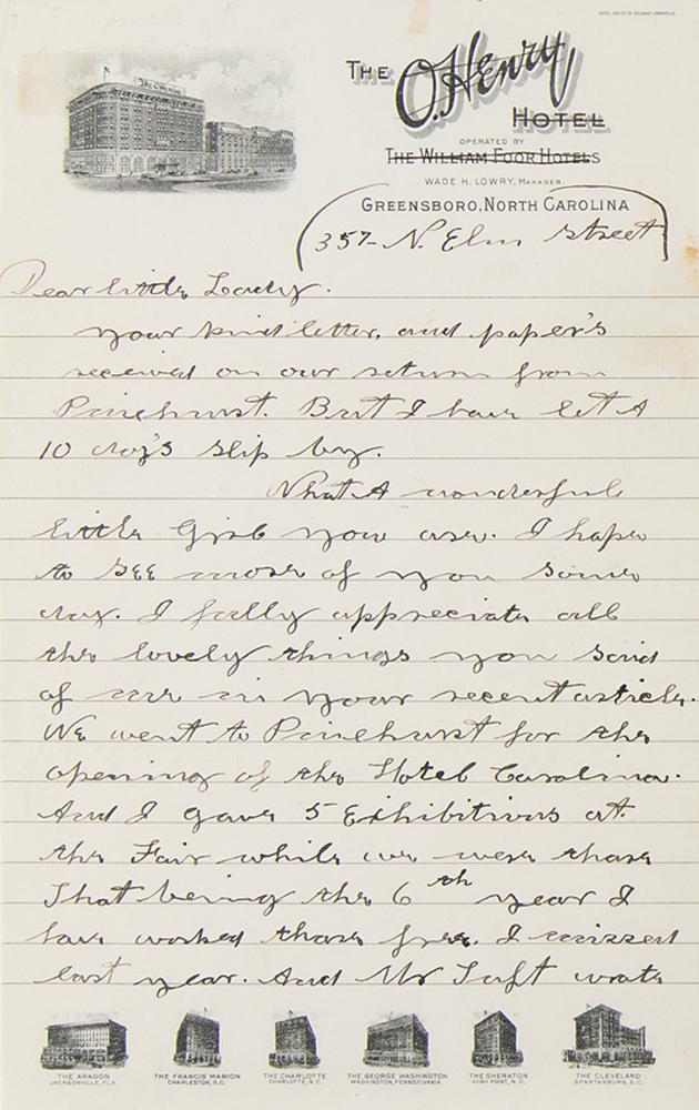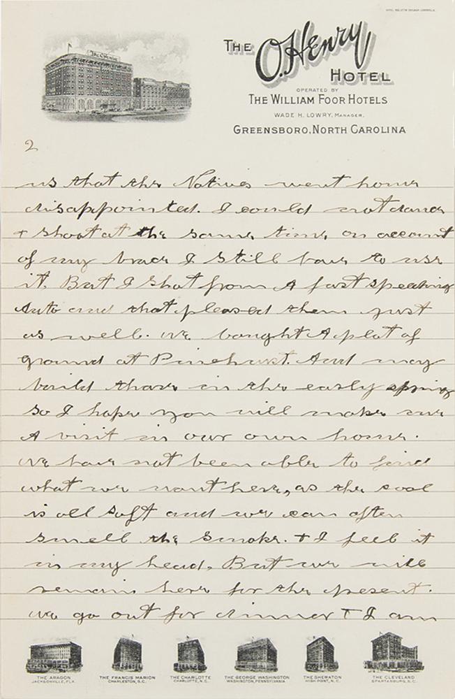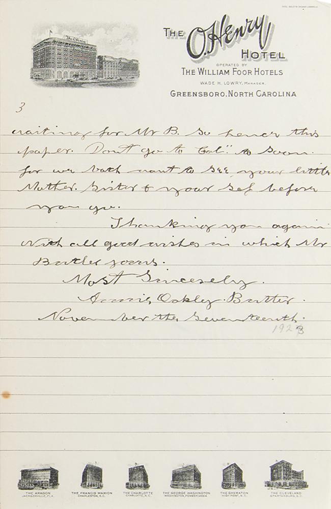 ALS signed “Annie Oakley Butler,” three pages, 6 x 9.25, The O. Henry Hotel letterhead, November 17, [1923]. Handwritten letter beginning "Dear little Lady," in part: "Your kind letter, and papers received on our return from Pinehurst. But I have let a 10 days slip by. What a wonderful little girl you are. I hope to see more of you some day. I fully appreciate all the lovely things you said of me in your recent article. We went to Pinehurst for the opening of the Hotel Carolina, and I gave 5 exhibitions at the Fair while we were there. That being the 6th year I have worked there free. I missed last year. And Mr. Luft wrote us that the Natives went home disappointed. I could not dance & shoot at the same time on account of my brace I still have to use it. But I shot from a fast speeding Auto and that pleased them just as well. We bought a plot of ground at Pinehurst. And may build there in the early spring. So I hope you will make me a visit in our own home. We have not been able to find what we want here, as the soil is all soft and we can often smell the smoke & I feel it in my head. But we will remain for the present." In fine condition.