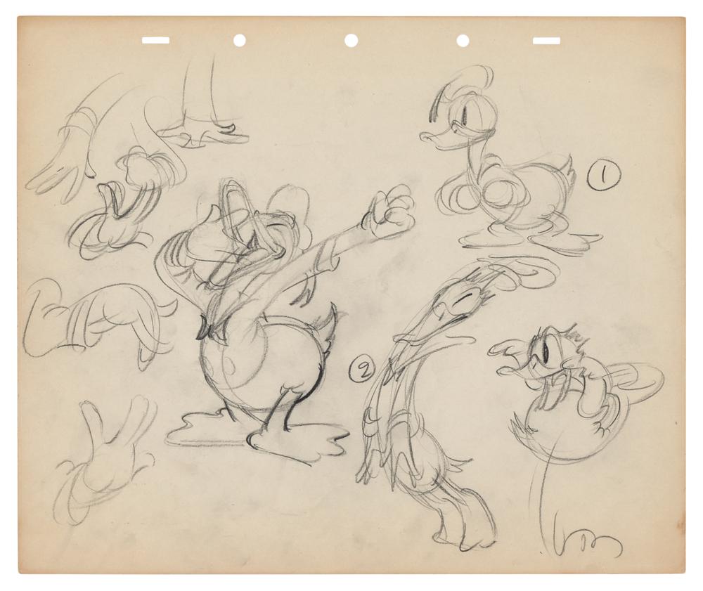 (Walt Disney Studios, 1937-1941) Original preliminary model sheet drawing of Donald Duck by noted character animator Preston Blair, showing Donald in four full-length action poses in addition to a group of six different hand-arm movement sketches. Accomplished in graphite on untrimmed 12 x 10 animation paper. Total character image measures 11 x 8.75. In fine condition.