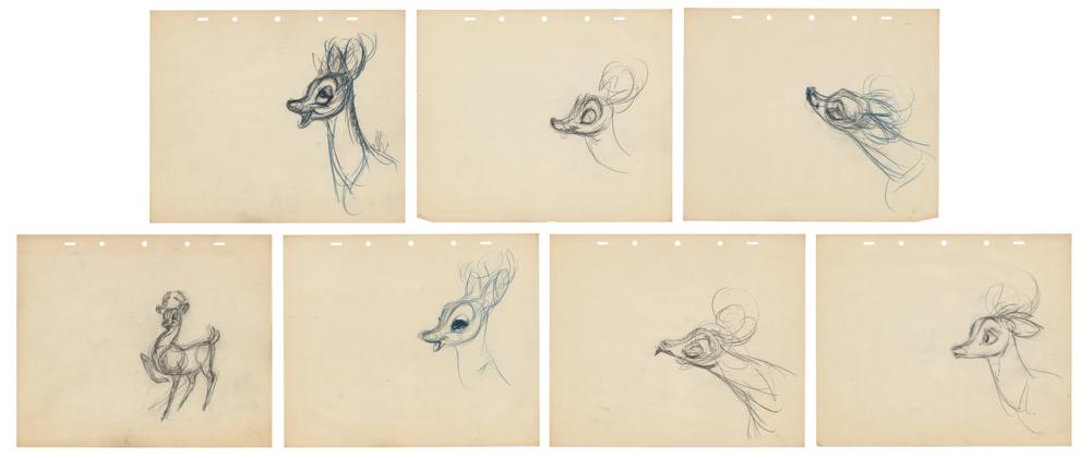 (Walt Disney Studios, 1942) Group of seven original rough production drawings of Bambi by noted character animator Preston Blair, six of which show the young antlered buck in close-up and one depicts Bambi in a happy full-length pose. Each is accomplished in graphite and colored pencil on an untrimmed 12 x 10 sheet of animation paper. Character images range in size from 3.75 x 6 to 6.5 x 7. In overall fine condition, with some light creases and folds to borders, and a couple of small edge tears.