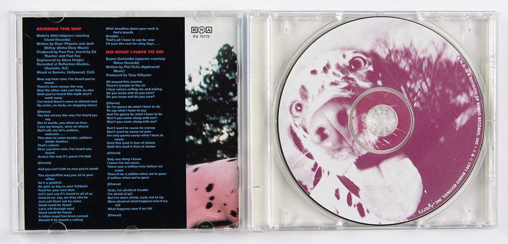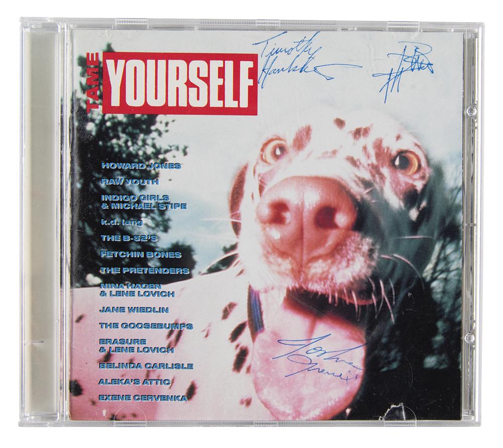 Tame Yourself CD signed on the front of the booklet in blue ballpoint by River Phoenix, Tim Hankins, and Josh Greenbaum. In fine condition. The CD is included. The three were part of the Gainesville folk-rock group Aleka's Attic, whose song 'Across the Way' appears on this compilation album.