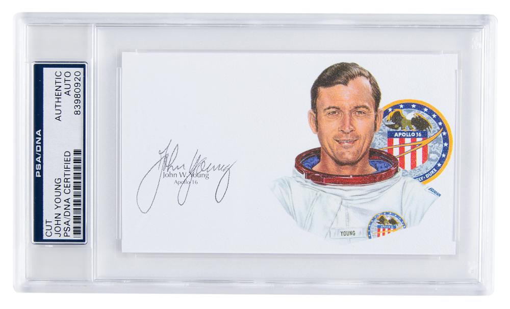 Pencil signature, "John Young,” on a white 5 x 3 card imprinted with his name and an artist's portrait of the moonwalker with the Apollo 16 emblem. In very fine condition. Encapsulated in a PSA/DNA authentication holder.
