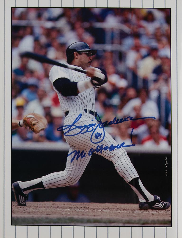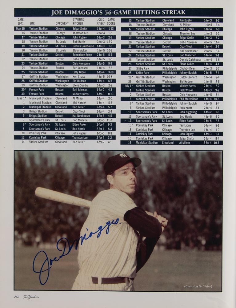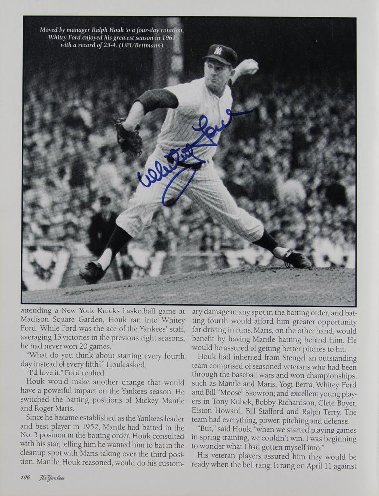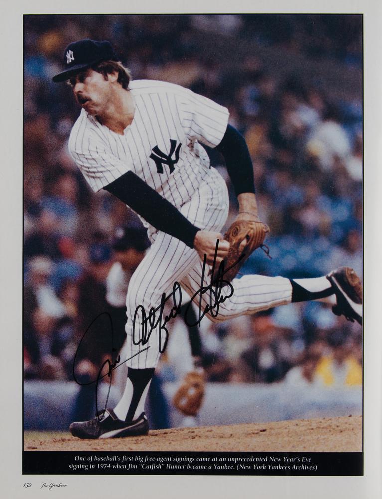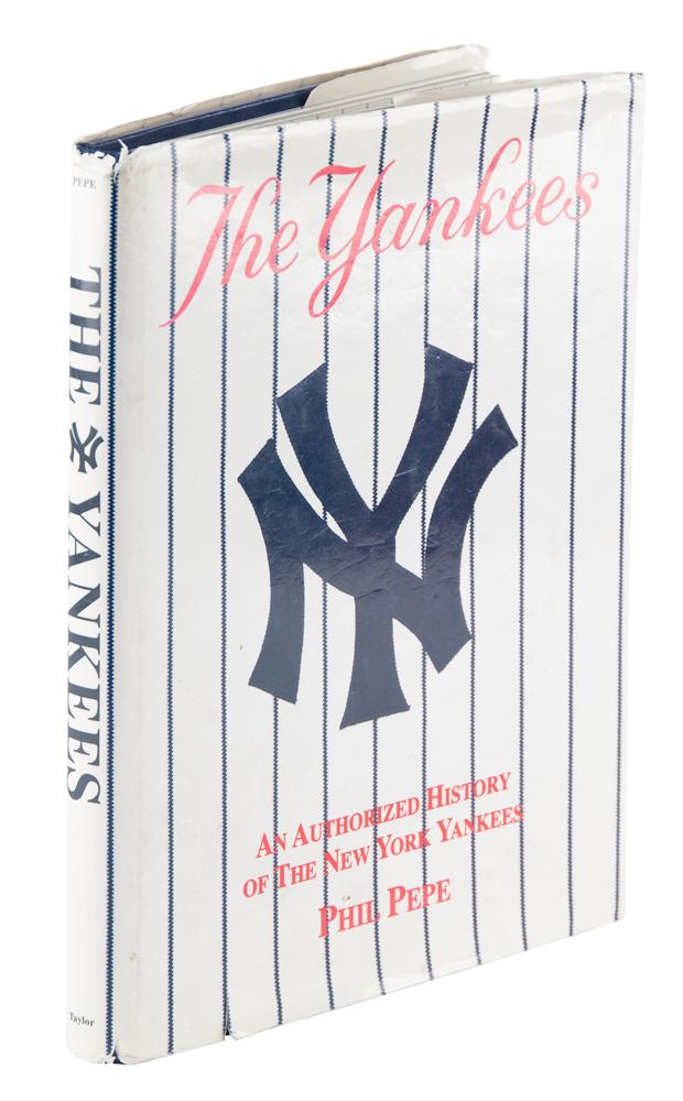 Signed book: The Yankees: An Authorized History of the New York Yankees. Dallas, TX: Taylor Publishing, 1995. Hardcover with dust jacket, 8.75 x 11.25, 228 pages. The book boasts over 100 signatures of New York Yankees legends (as well as some famous opponents), with many signing together on the rear endpapers; some sign more than once. Signers include: Joe DiMaggio, Whitey Ford, Yogi Berra, Reggie Jackson, Jim 'Catfish' Hunter, Goose Gossage, Dave Winfield, Bob Feller, Don Larsen, Enos Slaughter, Ron Guidry, Bob Turley, Tom Henrich, Hank Bauer, Jerry Coleman, Gil McDougald, Luis Arroyo, Bill Stafford, John Blanchard, Jimmy Key, Phil Pepe, Al Gionfriddo, Spec Shea, Clete Boyer, Tom Tresh, Tony Kubek, Moose Skowron, Bobby Richardson, Jim Coates, Billy Gardner, Tex Clevenger, Ralph Terry, Ralph Houk, Joe Pepitone, Al Downing, Jim Bouton, Phil Linz, Bobby Murcer, Sparky Lyle, Horace Clarke, Gene Michael, Ron Blomberg, Mickey Rivers, Ed Figueroa, Roy White, Mickey Rivers, Chris Chambliss, Paul Blair, Ken Holtzmann, Graig Nettles, Dick Tidrow, Cliff Johnson, Brian Doyle, Bobby Shantz, Tommy John, Ryne Duren, Art Ditmar, Joe Torre, Frank Howard, Steve Balboni, Steve Sax, Luis Tiant, Bobby Cox, Irv Noren, Tippy Martinez, Jesse Gonder, Bert Campaneris, Ralph Branca, John Montefusco, Lindy McDaniel, Oscar Gamble, Jose Canseco, Johnny Kucks, Ron Swoboda, Fred Stanley, Dale Berra, Fritz Peterson, Hal Reniff, and many more. In fine condition, with light wear to the dust jacket.