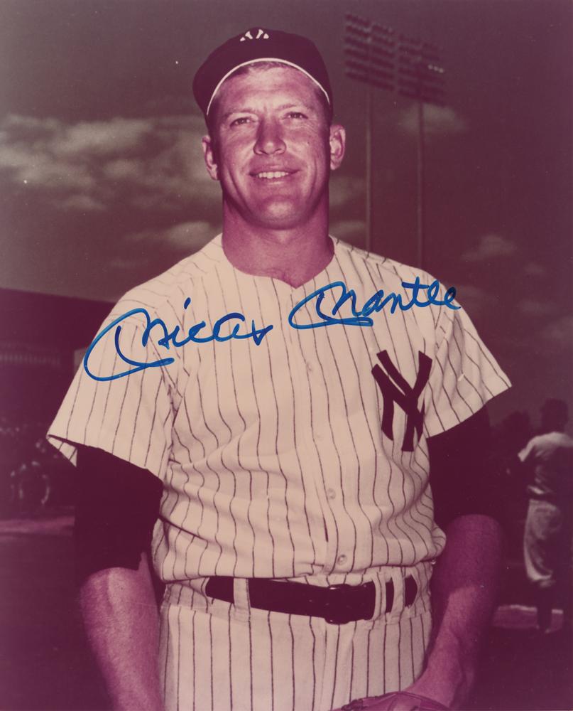 Glossy 8 x 10 photo of Mickey Mantle posing in his New York Yankees pinstripes, signed in blue felt tip. In fine condition, with a small crease touching Mantle's mouth.