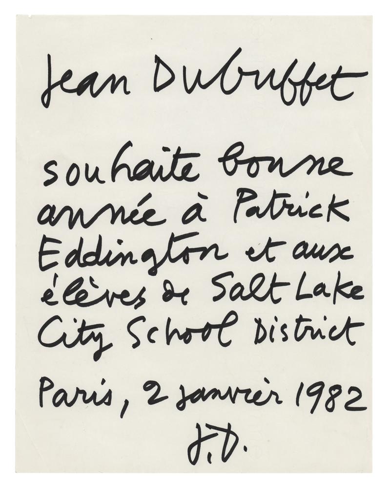 French painter and sculptor (1901-1985) known for founding the 'Art Brut' movement. Third-person ALS in French, one page, 8.25 x 10.5, January 2, 1982. In full: "Jean Dubuffet wishes happy new year to Patrick Eddington and the students of Salt Lake School District, Paris, January 2, 1982." In fine condition, with light creasing to the side edges.
