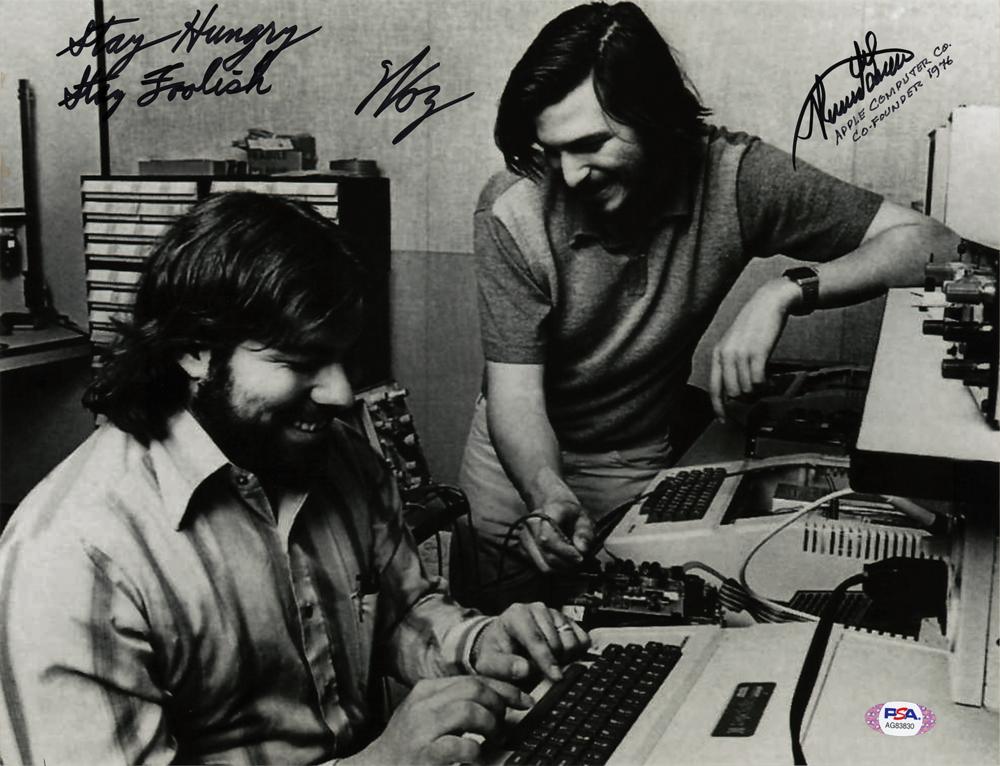 Satin-finish 14 x 11 photo of Steve Wozniak and Steve Jobs working together in Apple's early days, signed in black felt tip, "Stay Hungry, Stay Foolish, Woz," and "Ronald G. Wayne, Apple Computer Co., Co-Founder 1976." In fine condition, with a PSA/DNA label affixed to the lower right (certificate of authenticity not present).