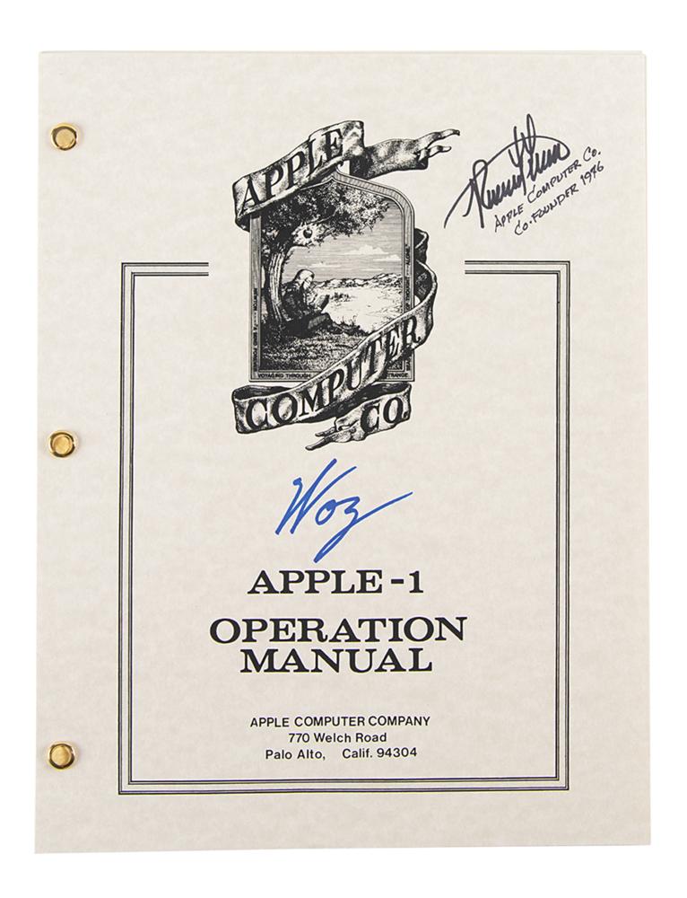 Brad-bound facsimile of the original Apple-1 operation manual, 8.5 x 11, 12 pages, signed on the front cover in blue and black felt tip by Apple co-founders Steve Wozniak ("Woz") and Ron Wayne ("Ronald G. Wayne, Apple Computer Co., Co-Founder 1976"). In fine condition.
