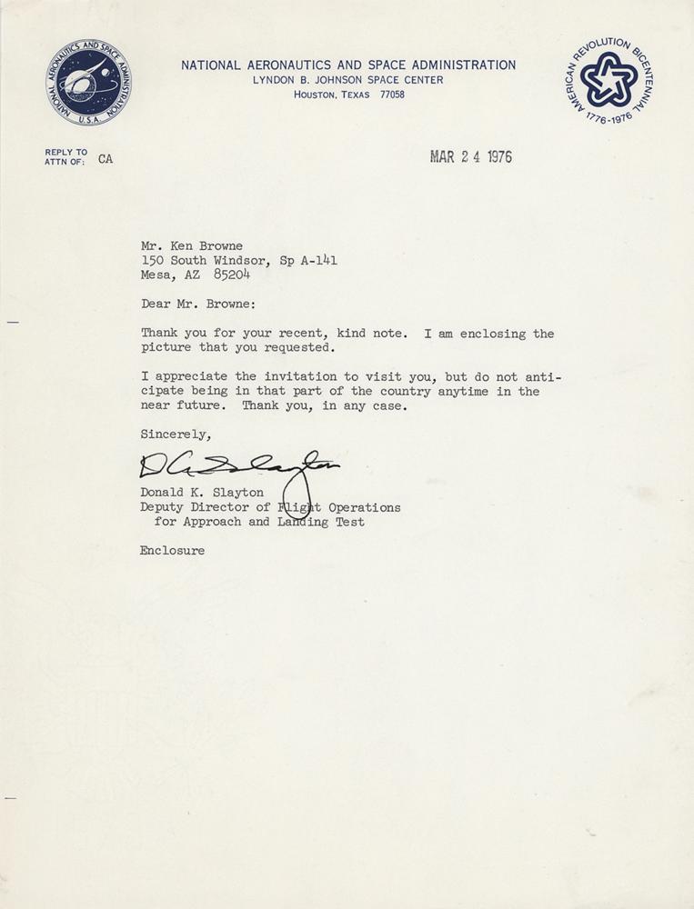 TLS signed “D. K. Slayton,” one page, 8 x 10.5, NASA letterhead, March 24, 1976. Letter to Ken Browne, in full: "Thank you for your recent, kind note. I am enclosing the picture that you requested. I appreciate the invitation to visit you, but do not anticipate being in that part of the country anytime in the near future. Thank you, in any case." In fine condition.