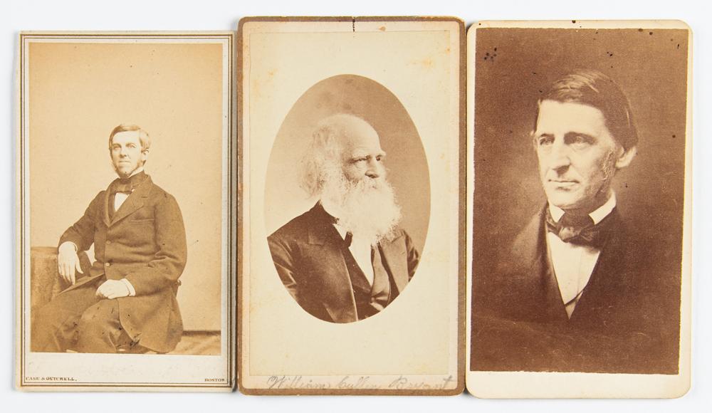Three 2.5 x 4 carte-de-visite photographs of 19th-century New England authors, including: a bust portrait of Ralph Waldo Emerson by Warren of Cambridgeport; a three-quarter-length seated portrait of Oliver Wendell Holmes, Sr., by Case & Getchell of Boston; and an oval portrait of William Cullen Bryant by an anonymous studio. In fine condition, with various ink and pencil identification notations in unknown hands.