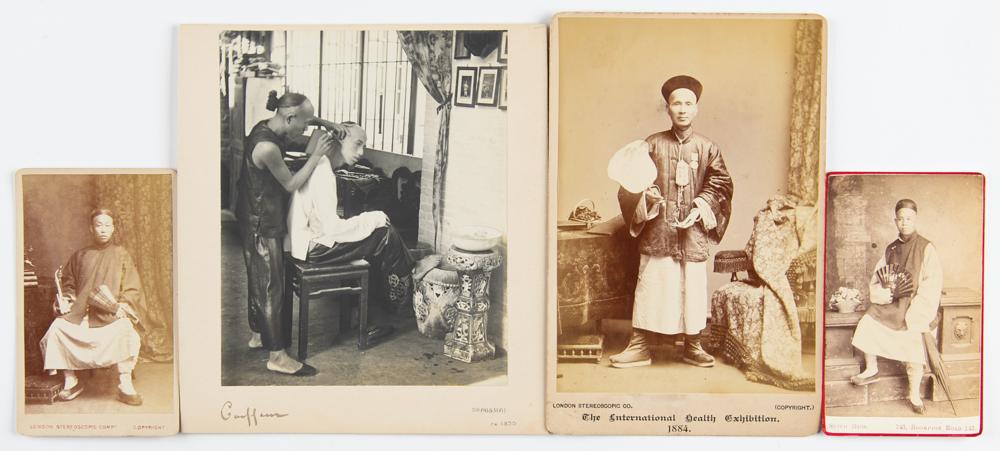 Four 19th-century photographs of exotic scenes and people, ranging in size from 2.5 x 4 to 4.25 x 6.5, including: two carte-de-visite photos of men in traditional attire, one by the London Stereoscopic Company and the other by Sutch Bros. of London; one cabinet photo of a man in similar dress by the London Stereoscopic Co., with "The International Health Exhibition, 1884," imprinted on the mount; and a matte-finish mounted photo of a Shanghai scene, circa 1890. In fine condition, with a few small pencil notations.