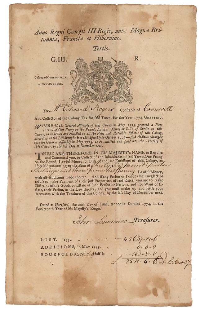 Treasurer of the Colony and State of Connecticut (1719-1802) and the commissioner of loans for the United States during the American Revolution. Partly-printed DS, one page, 7.5 x 12.25, June 20, 1774. Colony of Connecticut document, issued on behalf of King George III, directing Edward Rogers as constable of Cornwell, to "Collect of the Inhabitants of said Town, One Penny on the Pound, Lawful Money, or Bills of the late Emissions of this Colony?amounting to the Sum of Thirty Six pounds fourteen Shillings and three pence half penny." Signed at the conclusion by John Lawrence as treasurer. In very good to fine condition, with scattered staining and irregular light toning.