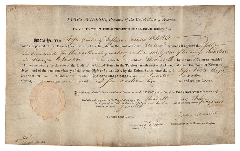 War-dated partly-printed vellum DS as president, one page, 14.75 x 9, July 30, 1812. President Madison grants Jesse Foster of Jefferson County, Ohio, a parcel of land "to be sold at Steubenville by the act of Congress, entitled 'An act providing for the sale of the lands of the United States in the Territory north west of the Ohio, and above the mouth of Kentucky river.'" Signed at the conclusion by James Madison and countersigned by Commissioner of the General Land Office Edward Tiffin. Lower left retains the original General Land Office seal. In very good to fine condition, with light toning, soiling, and multiple intersecting folds.