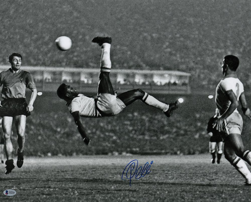 Dramatic satin-finish 19.5 x 15.75 photo of Pele performing a bicycle kick, signed in blue felt tip. In fine condition, with a Beckett label affixed to the lower left corner. Accompanied by a certificate of authenticity from Beckett Authentication Services.