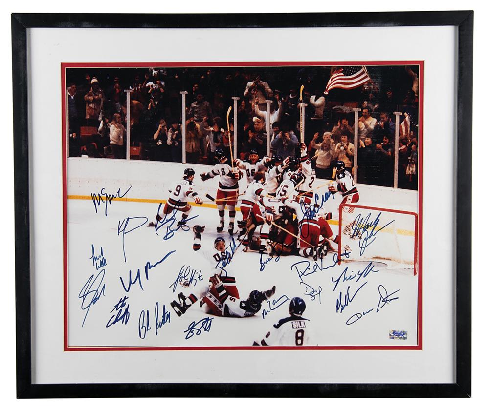 Color glossy 19.25 x 15.25 photo of the iconic 1980 'Miracle on Ice' U.S. Olympic hockey team celebrating their historic victory, signed in black felt tip by the full 20-man roster: Mike Eruzione, Jim Craig, Bill Baker, Phil Verchota, Mike Ramsey, Buzz Schneider, Bob Suter, Ken Morrow, Dave Silk, Mark Wells, Mark Johnson, Jack O'Callahan, Mark Pavelich, Steve Christoff, Dave Christian, Steve Janaszak, Rob McClanahan, Neal Broten, John Harrington, and Eric Strobel. Double-matted and framed to an overall size of 25 x 21. In very good to fine condition, with light overall wrinkling.