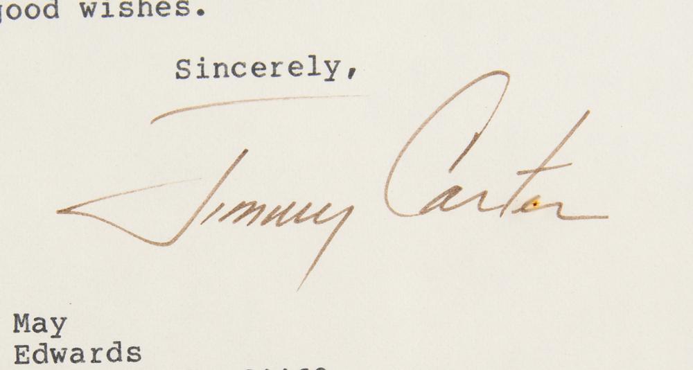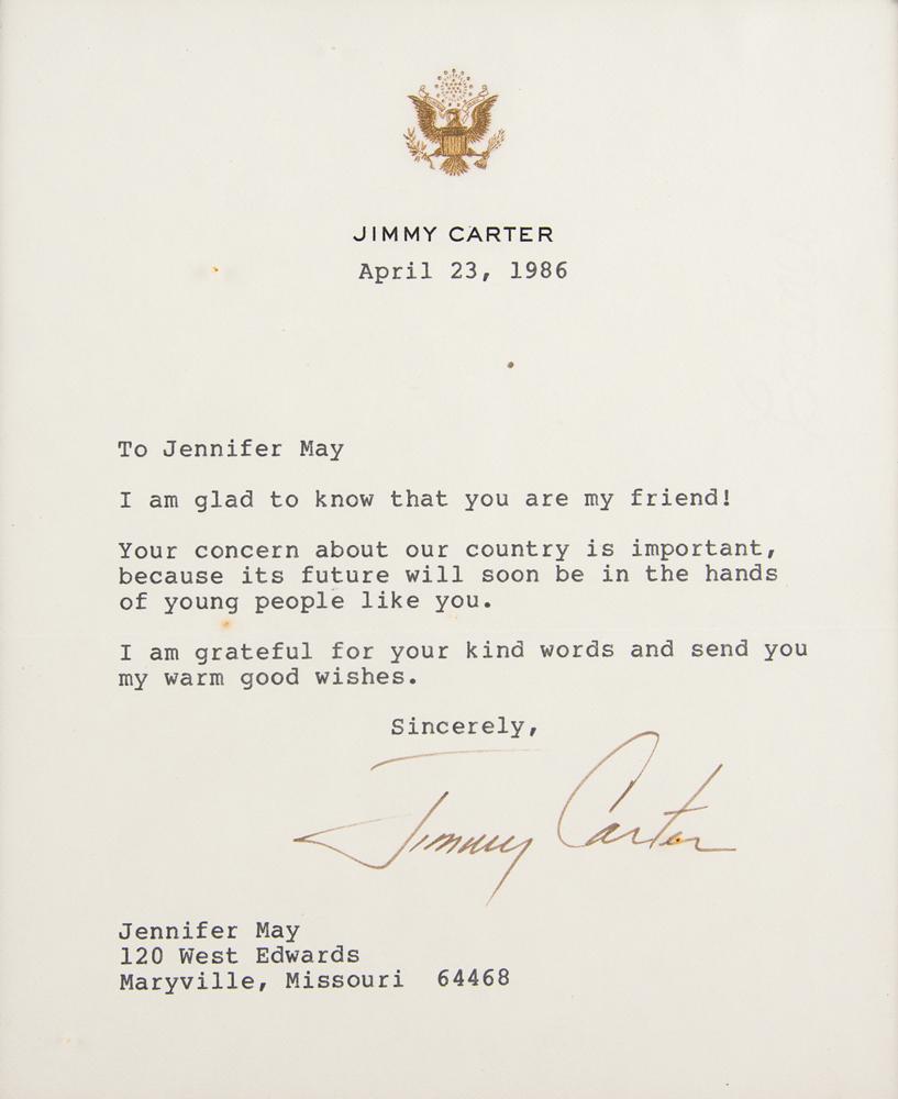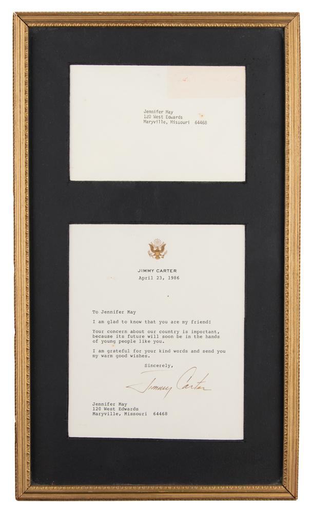 TLS, one page, 6 x 7.25, personal letterhead, April 23, 1986. Letter to Jennifer May in Missouri, in full: "I am glad to know that you are my friend! Your concern about our country is important, because its future will soon be in the hands of young people like you. I am grateful for your kind words and send you my warm good wishes." Matted and framed with the original mailing envelope to an overall size of 9.75 x 16.75. In fine condition.