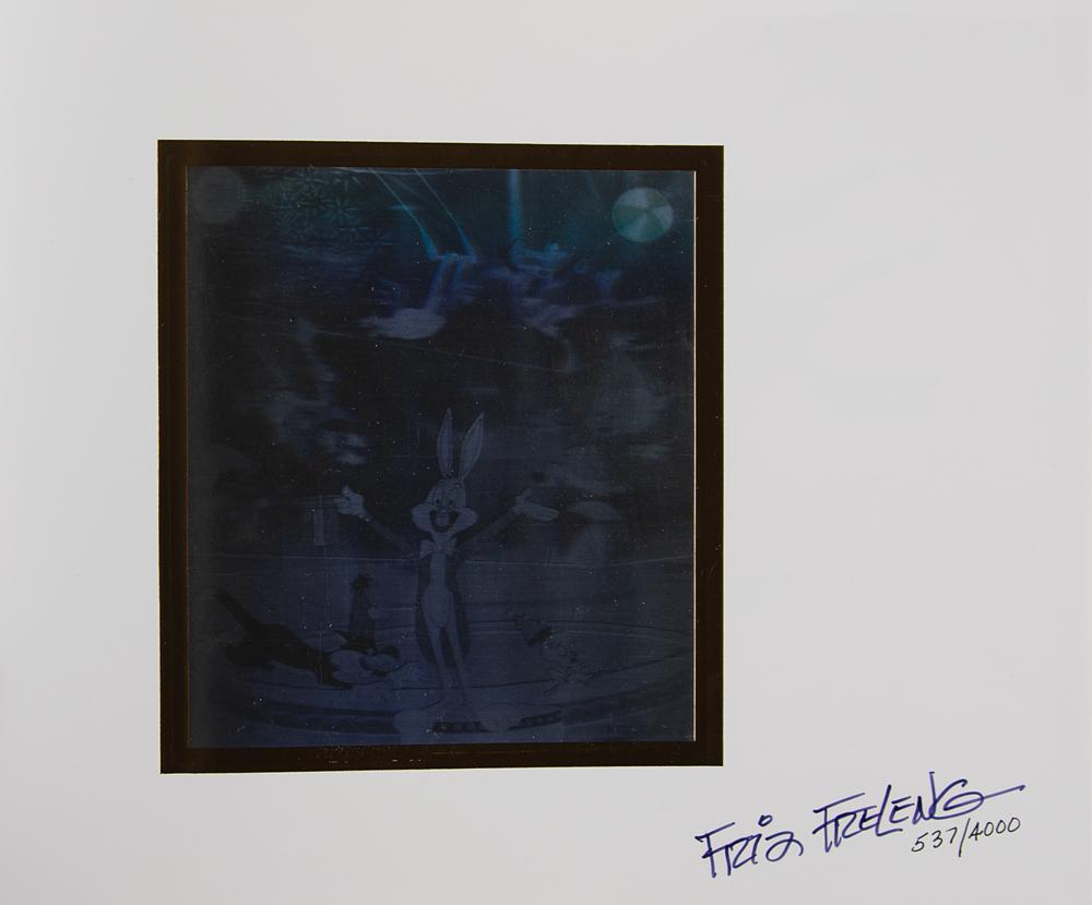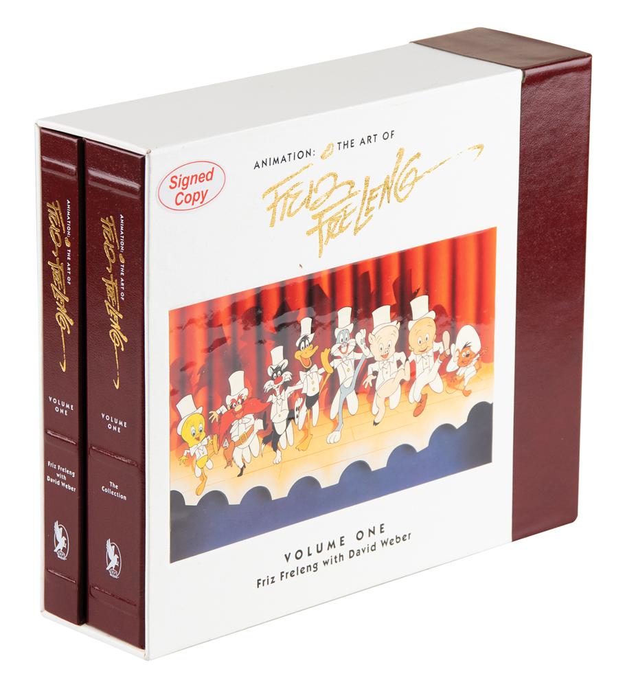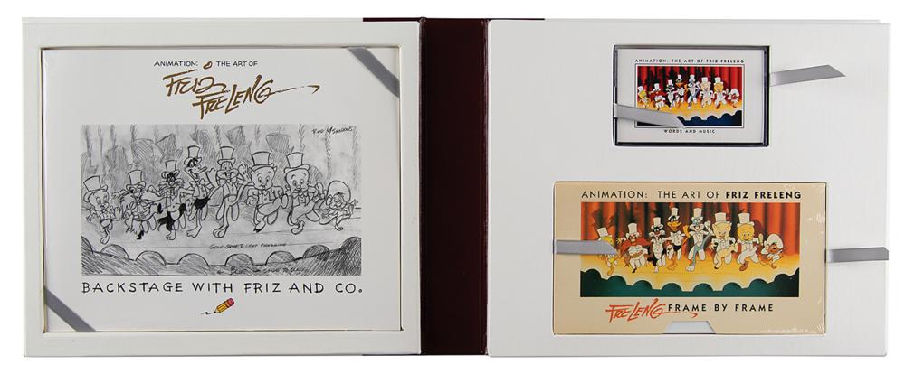 Signed book: Animation: The Art of Friz Freleng. First edition, limited issue, numbered 537/4000. Newport Beach, CA: Donovan Publishing, 1994. Hardcover, 11.5 x 9.5, 239 pages. Signed on an opening hologram page in black felt tip by Friz Freleng. The set includes one book examining the life and creative genius of Friz Freleng, and one set containing an animator's workbook, an audio tape entitled Animation: The Art of Friz Freleng, Words and Music, and a video tape entitled Freleng: Frame by Frame. In very good to fine condition, with a few edge tears to the label on the slipcase and a "Signed Book" label to the slipcase.