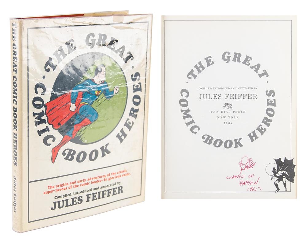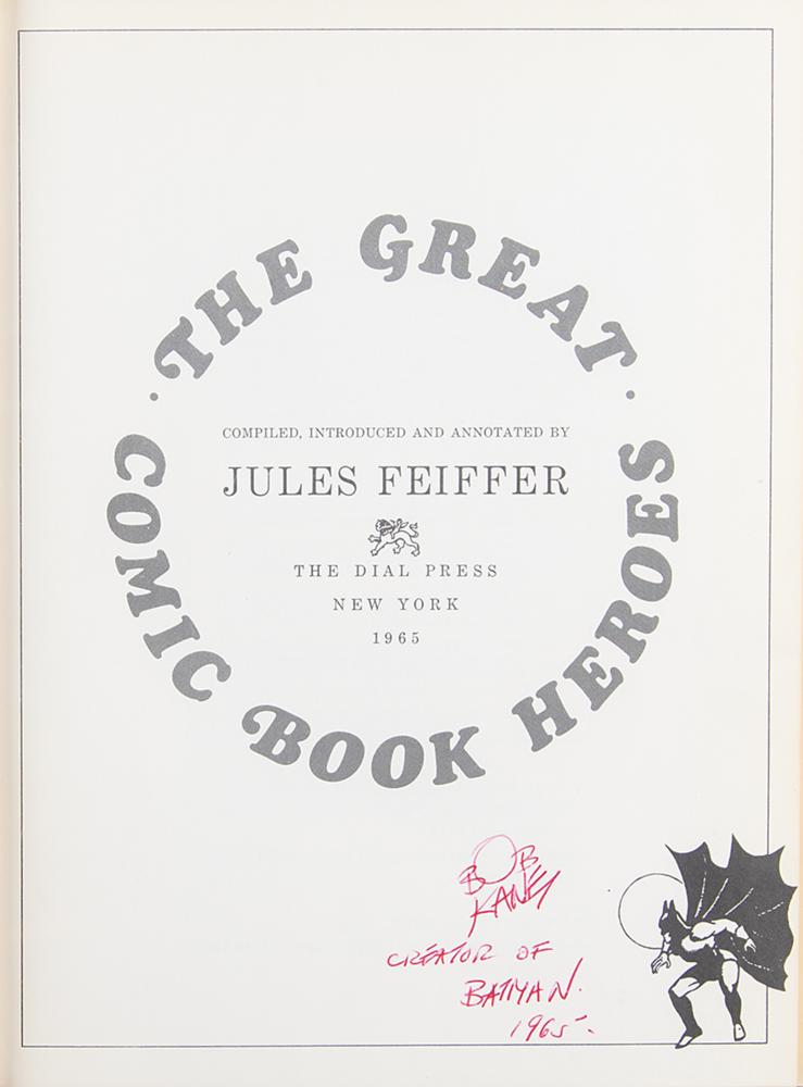 Signed book: The Great Comic Book Heroes. First edition, first printing. NY: The Dial Press, 1965. Hardcover with dust jacket, 9.25 x 12.25, 189 pages. Signed on the title page in red ballpoint, "Bob Kane, Creator of Batman, 1965." In fine condition, with light soiling and wear to the dust jacket.