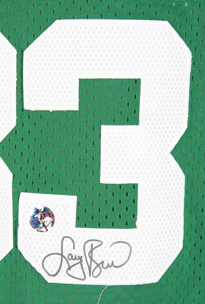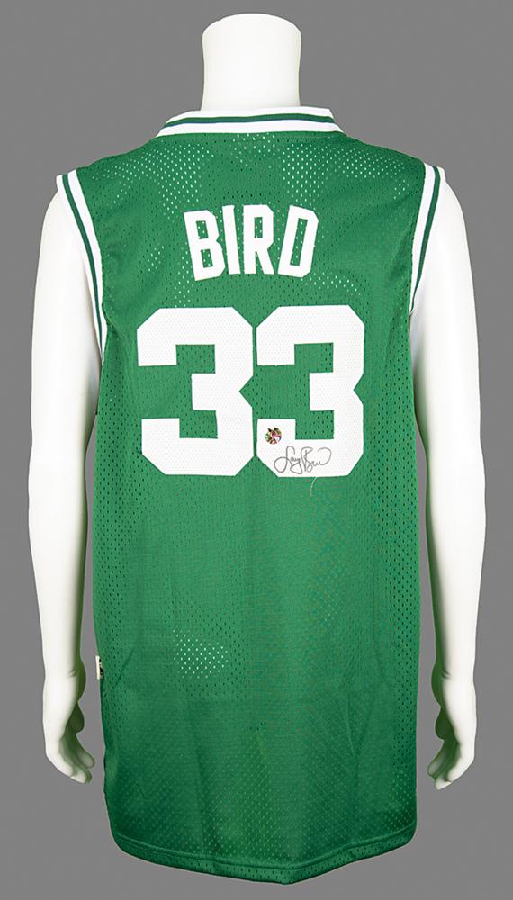 Desirable Adidas Hardwood Classics replica Boston Celtics Larry Bird basketball jersey, with sewn on letters and numbers, size XL, signed on the number on the back in by Bird. In very fine condition.
