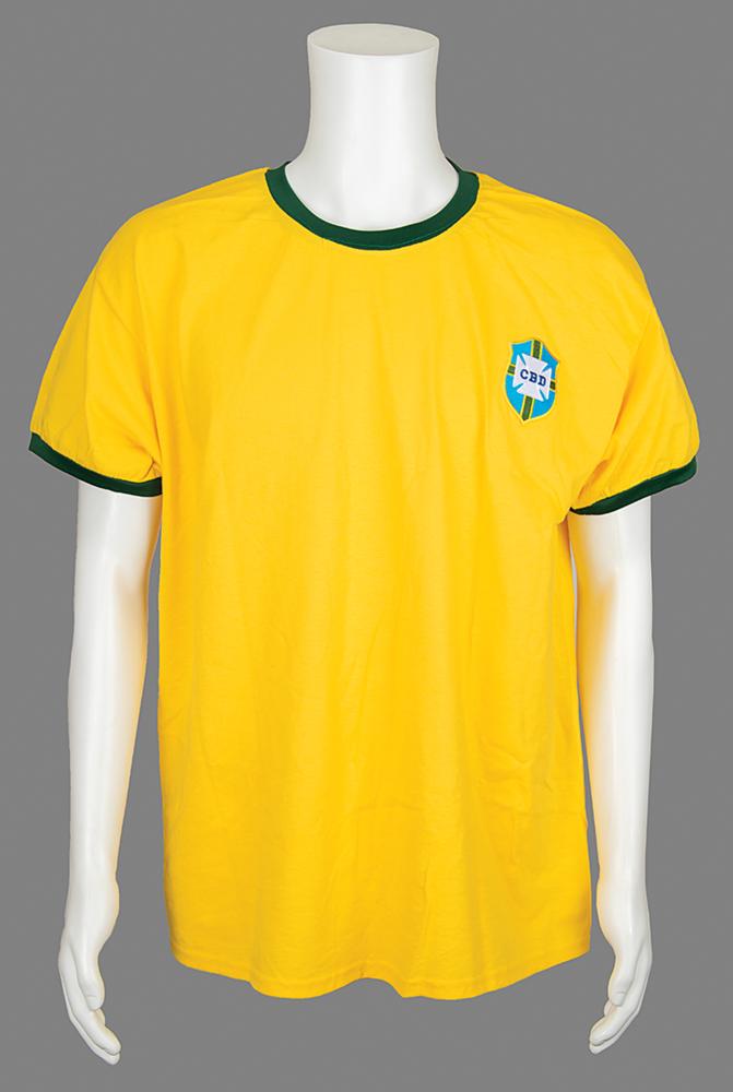 Copa Mundo replica CBD Brazil Pele soccer jersey, size XL, prominently signed on the reverse in black felt tip by Pele. In very fine condition, with a PSA/DNA label affixed to the number (certificate of authenticity not present).