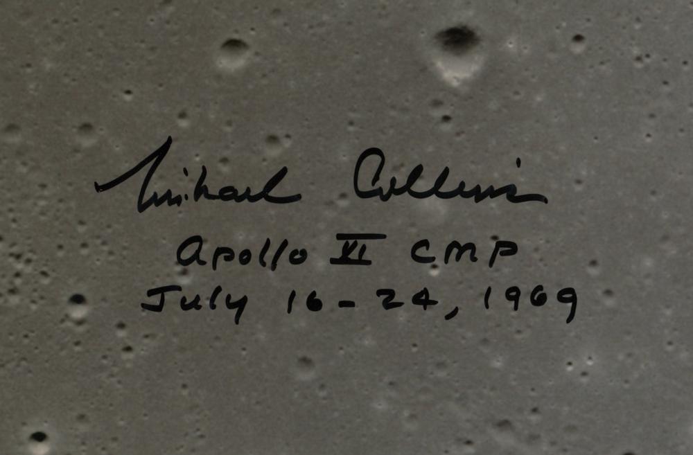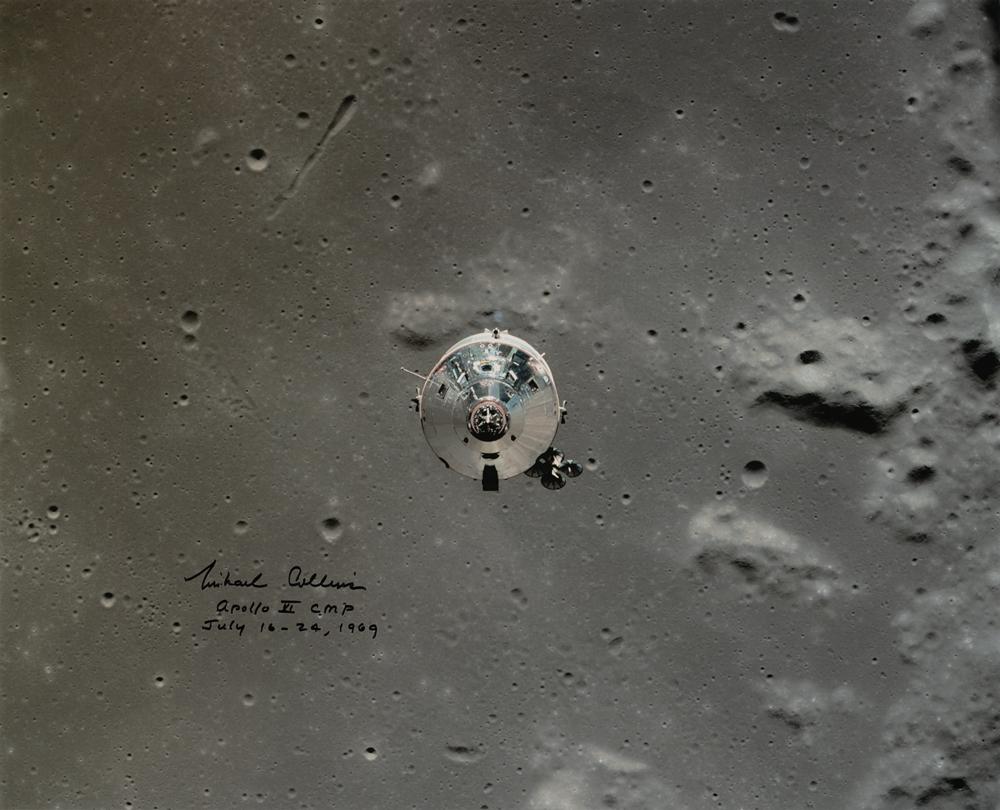 Color satin-finish 20 x 16 photo of the Command Module Columbia soaring high above the lunar surface during the Apollo 11 mission, signed in black felt tip, "Michael Collins, Apollo XI CMP, July 16-24, 1969." In fine condition. Accompanied by a certificate of authenticity from Novaspace.