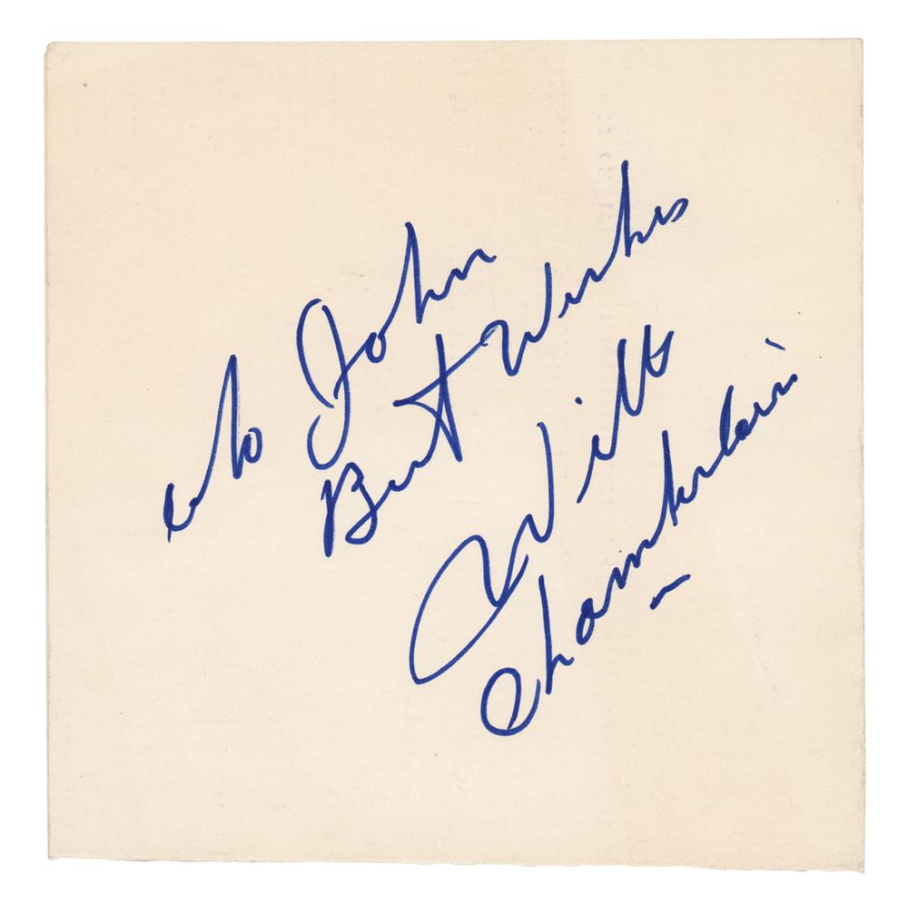 Felt tip signature and inscription, "To John, Best wishes, Wilt Chamberlain,” on an off-white 5.5 x 5.5 sheet. In fine condition.