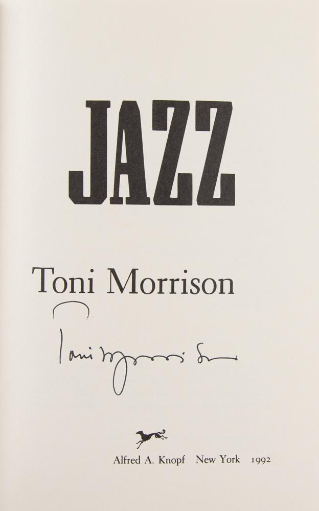 Two books by Toni Morrison: a first trade edition of Jazz, hardcover with dust jacket, published by Alfred A. Knopf in 1992, signed on the title page in black ink; and a first edition of The Nobel Lecture in Literature, 1993, clothbound hardcover, published by Alfred A. Knopf in 1994, signed on the first free end page in black ink. In overall fine condition.