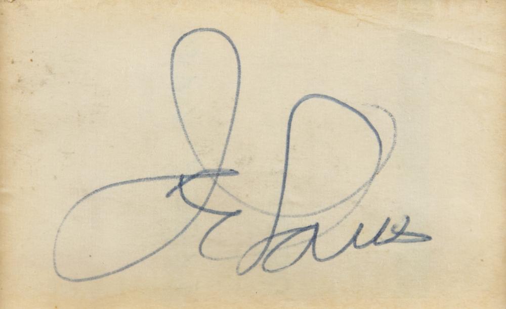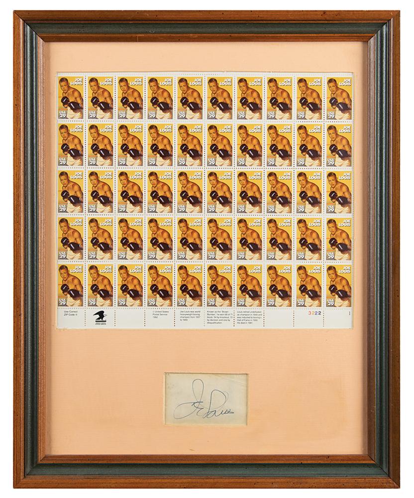 Vintage ballpoint signature, "Joe Louis,” on an off-white 2.75 x 1.75 sheet. Matted and framed with a large sheet of 29-cent stamps to an overall size of 12.75 x 15.75. In very good to fine condition, with light toning and creasing.