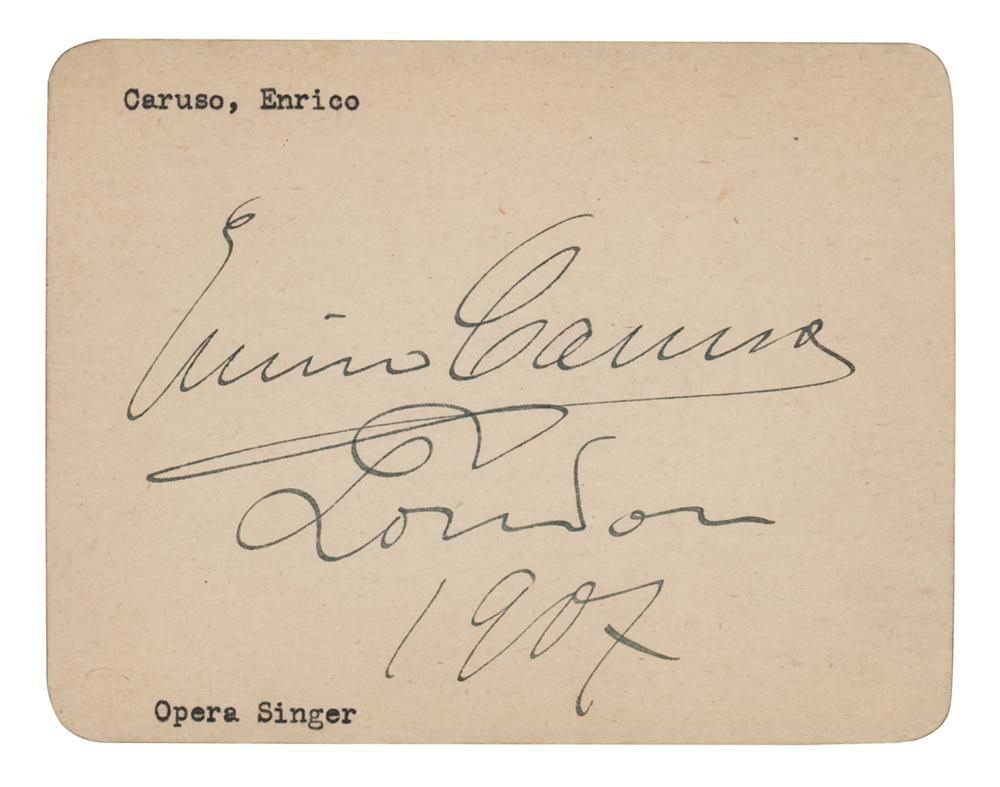 Vintage fountain pen signature, "Enrico Caruso, London, 1907,” on an off-white 4.5 x 3.5 card. In very fine condition.