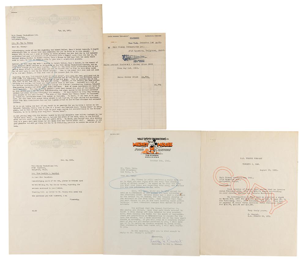 Letter and document group lot related to the publication of the song ‘The Wedding Party of Mickey Mouse’ and a Disney book entitled ‘Mickey Mouse Book,’ which is highlighted by a TLS from Lucille A. Benedict, the secretary to Roy O. Disney, dated October 6, 1931, typed on illustrated Walt Disney Productions, Ltd. Mickey Mouse Sounds Cartoons letterhead, in part: “Mr. Disney is still awaiting a reply from you as to what you are doing with the song ‘The Wedding Party of Mickey Mouse’?Also, Mr. Lang, would you be kind enough to send me a statement of all monies you have collected on the Bibo-Kang book? Several weeks ago I sent a statement to the Kresge Co. at Canada, for the balance showing on the accounts as due from them. They replied that they had sent checks to you in New York covering their entire balance. I have therefore charged this amount to your account.” Included with this letter is the referenced “statement” sent to Benedict from Bibo-Lang, Inc., December 1, 1931, affirming a total sales of $24,994 for the “Mickey Mouse Book,” and a copy of the referenced reply from the S.S. Kresge Company on August 28, 1931. Also included with the lot is an apologetic two-page typed letter from the music publishing company Lee, Bernard, & Madison, Inc., dated October 15, 1931, addressed to Roy Disney and explaining the cause for late payments and confirming that the song ‘The Wedding Party of Mickey Mouse’ has been published. In overall fine condition.
