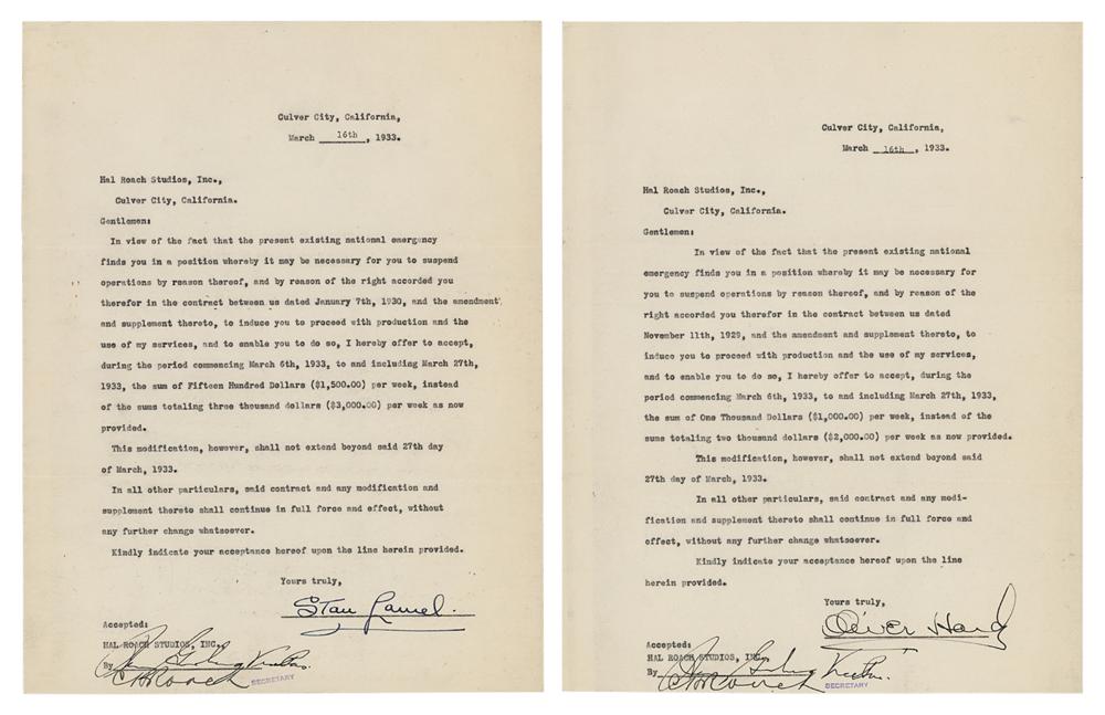 Two DSs, individually signed “Stan Laurel" and "Oliver Hardy,” both one page, 8.5 x 11, March 16, 1933, and issued to Hal Roach Studios. Both documents find Laurel and Hardy offering to cut half of their allotted tri-weekly salary between March 6 and 27, 1933, “In view of the fact that the present existing national emergency finds you in a position whereby it may be necessary for you to suspend operations.” Laurel agrees to decrease his check from $3000 to $1500 and Hardy agrees to lower his from $2000 to $1000. Signed by the comedians at the bottom of their respective documents. In overall fine condition.