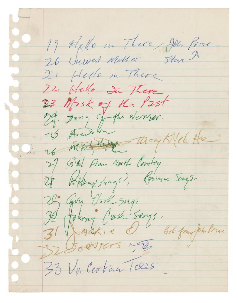 Unusual handwritten list by Johnny Cash, signed in the third person, no date, penned in multicolored ink on an off-white 8.5 x 11 sheet of notebook paper. The list, which is numbered 19 through 33, appears to name a variety of songs and artists, some of which are repeated, including: “Hello in There,” “Unwed Mother,” “Mask of the Past,” “Hoe Down,” “Girl from North Country,” “Rodney’s Songs? Rosanna’s Songs,” “Guy Clark songs,” “Johnny Cash songs,” “Jackie O,” and “Uncertain Texas.” Cash makes two references to Grammy Award-winning country-folk musician John Prine. In fine condition.