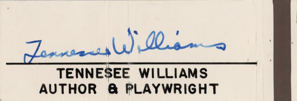 Blue ink signature, "Tennessee Williams,” on an unfolded 4.5 x 1.5 matchbook (sans matches). In fine condition.