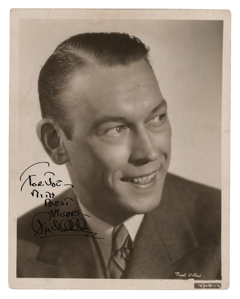 Vintage glossy 8 x 10 publicity photo of the comedian early in his career, signed and inscribed in bold fountain pen, "For Joe—with best wishes, Fred Allen." Reverse bears a Culver Pictures photo stamp. In very good to fine condition, with some light bends and creases.