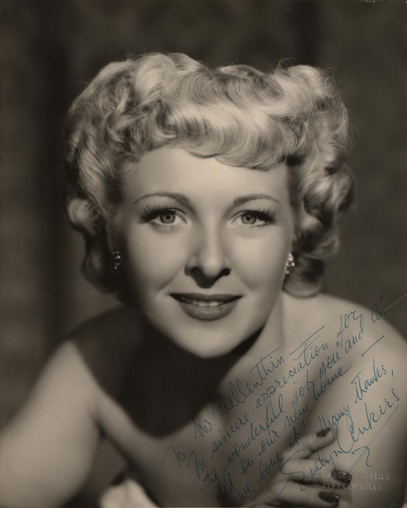 British-American actress (1918-1985) who often played variations on the role of the cultured young leading lady in many American horror films during the 1940s, most notably The Wolf Man (1941) opposite Lon Chaney Jr., who was a frequent screen partner. Vintage matte-finish 7.5 x 9.5 Cleeton-Titus studio portrait photo of the beloved horror movie actress, signed and inscribed in blue ballpoint, "To Mr. Mellenthin—In sincere appreciation for the wonderful job you 'and Co.' did on our new house—we love it! Many thanks, Evelyn Ankers.” In fine condition, with lightly trimmed edges.