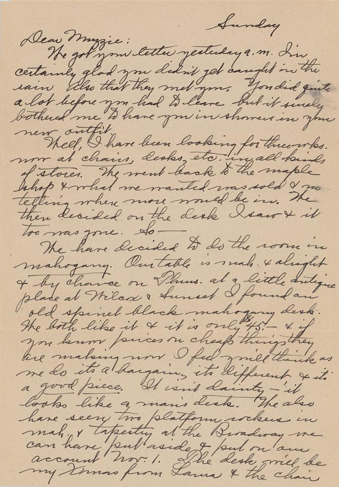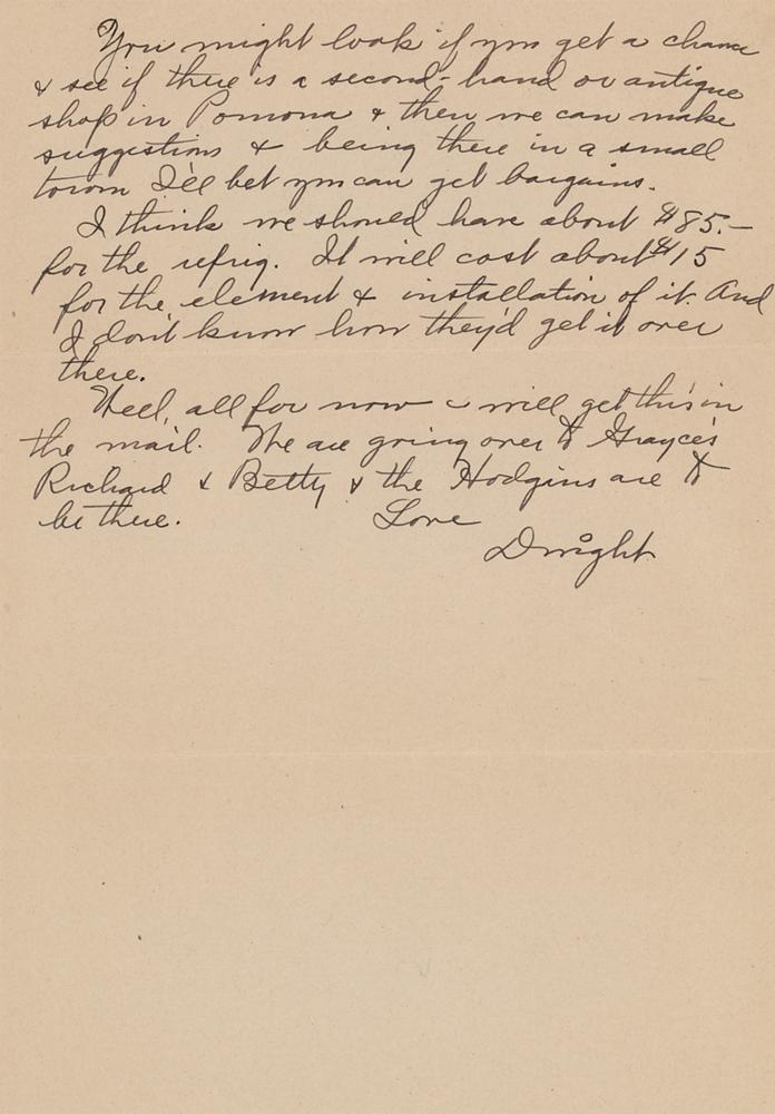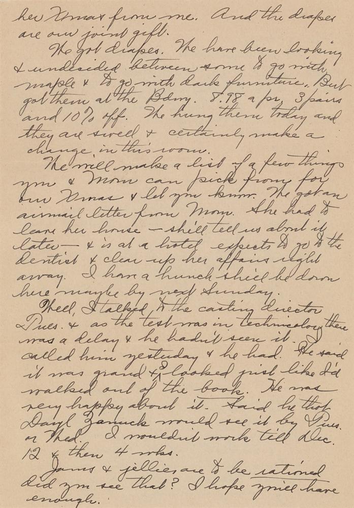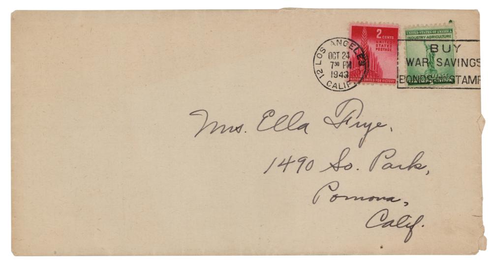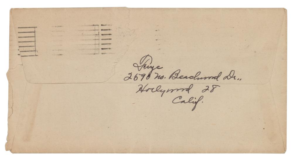 Character actor (1899-1943) who played the lunatic Renfield opposite Bela Lugosi in Dracula, as well as Colin Clive's assistant Fritz in Frankenstein. World War II-dated ALS signed “Dwight,” three pages, 7.25 x 10.25, October 24, 1943. Handwritten letter to “Muzzie,” his mother Ella, which finds Frye discussing his plans on furnishing his house: “We have decided to do the room in mahogany. Our table is mah. & alright & by chance on Thurs. At a little antique place at Wilcox & Sunset I found an old spinet black mahogany desk. We both like it & it is only $45—& if you know prices on cheap things they are making now I feel you’ll think as we do it’s a bargain, it’s different, & it’s a good piece. It isn’t dainty—it looks like a man’s desk?The desk will be my Xmas from Laura & the chair her Xmas from me. And the drapes are our joint gift.” Frye then talks about a recent audition: “Well, I talked to the casting director Tues. & as the test was in technicolor there was a delay & he hadn’t seen it. I called him yesterday & he had. He said it was grand & I looked just like I’d walked out of the book. He was very happy about it. Said he thought Daryl Zanuck would see it by Tues. or Wed. I wouldn’t work till Dec. 12 & then 4 wks.” He then briefly touches on a new effect of the ongoing war: “Jams & jellies are to be rationed, did you see that? I hope you will have enough.” In fine condition. Accompanied by the original mailing envelope hand-addressed by Frye, who incorporates his surname into the return address field on the reverse flap, a vintage-matte-finish portrait of the actor, and a TLS from his son, Dwight, forwarding his father’s letter to a collector. The role in question, which Frye would ultimately land, was for the Oscar-winning 1944 film Wilson, a biographical retelling of Woodrow Wilson’s political rise. The film was shot in Technicolor and personally produced by 20th Century Fox president Darryl F. Zanuck. Frye was cast as Secretary of War Newton D. Baker, but died of a heart attack at the age of 44 on November 7, 1943, a few days prior to his filming start, and just two weeks after writing this letter to his mom.