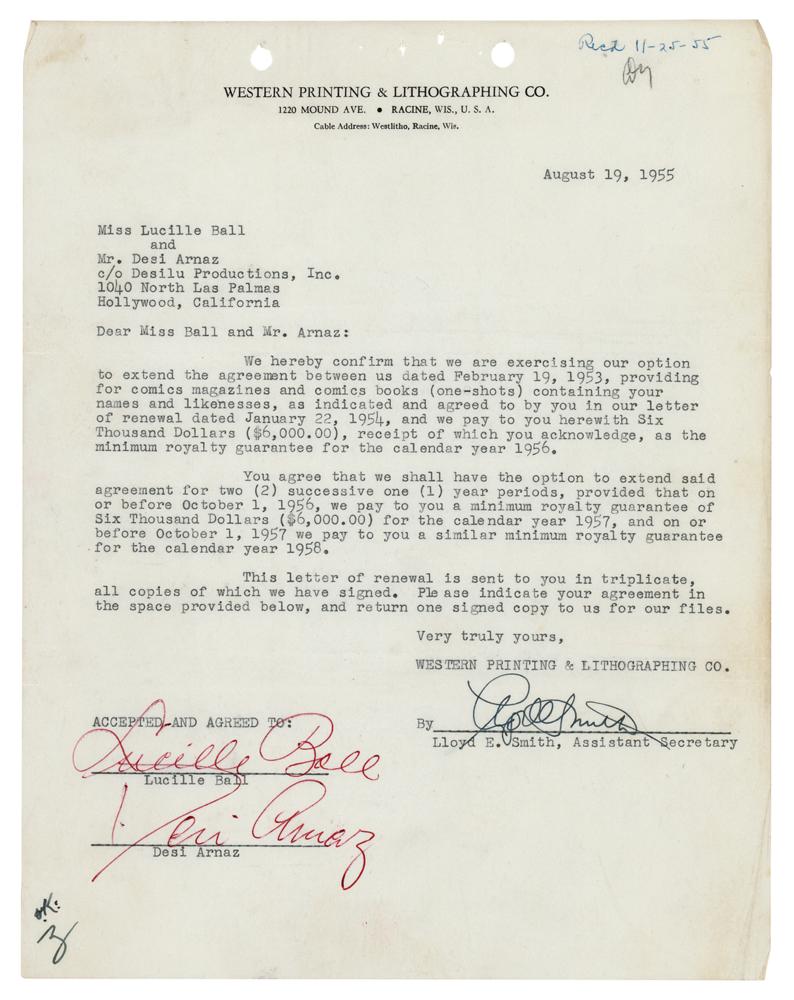 DS, one page, 8.5 x 11, August 19, 1955. A publication renewal contract between the Western Printing & Lithographing, Co., and Lucille Ball and Desi Arnaz, who agree to allow their names and likenesses in “comic magazines and comic books (one-shots).” Signed by both Ball and Arnaz at the conclusion in bold red ballpoint. In fine condition.