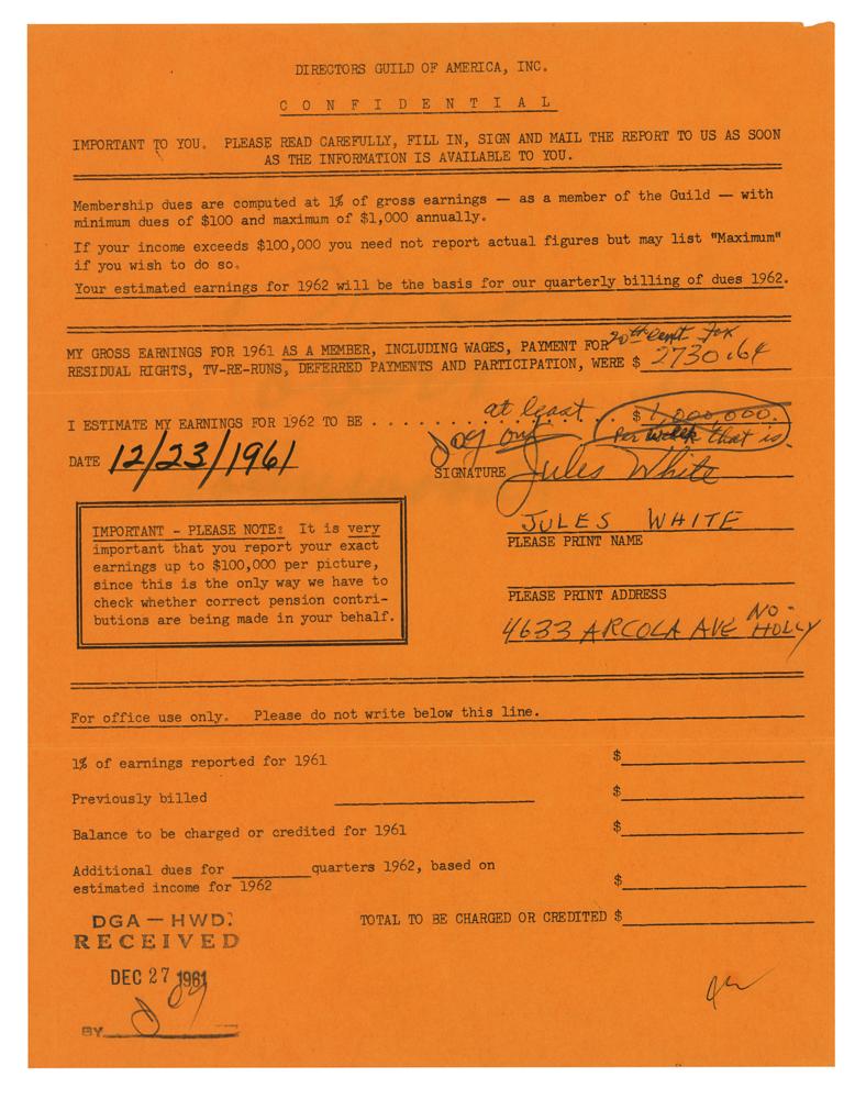 Hungarian-American film director and producer (1900-1985) who was best known for his short-subject comedies starring The Three Stooges. Almost 40% of White's output stars The Three Stooges; the other films feature such screen favorites as Buster Keaton, Andy Clyde, Harry Langdon, Hugh Herbert, Vera Vague, Gus Schilling and Richard Lane, and El Brendel. DS, one page, 8.5 x 11, December 23, 1961. Membership dues document from the Directors Guild of America for Jules White’s estimated earnings of 1962. White lists his 1961 membership earnings to be $2730.64,” and in the 1962 estimated field, he writes “at least $1,000,000, per week that is.” Below this White signs and prints his name and adds his address in black ballpoint. In fine condition.