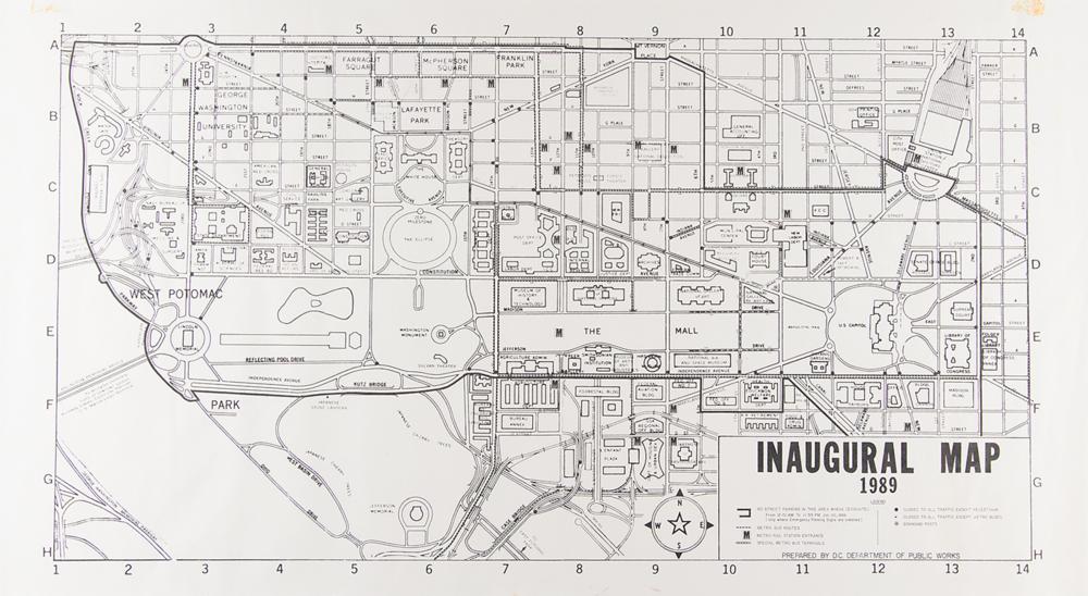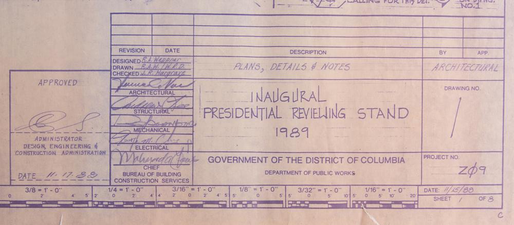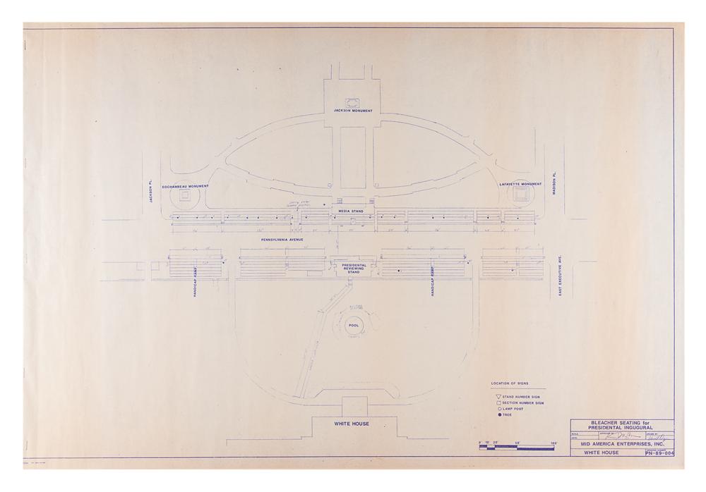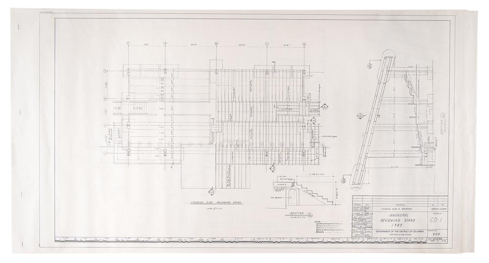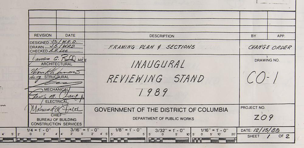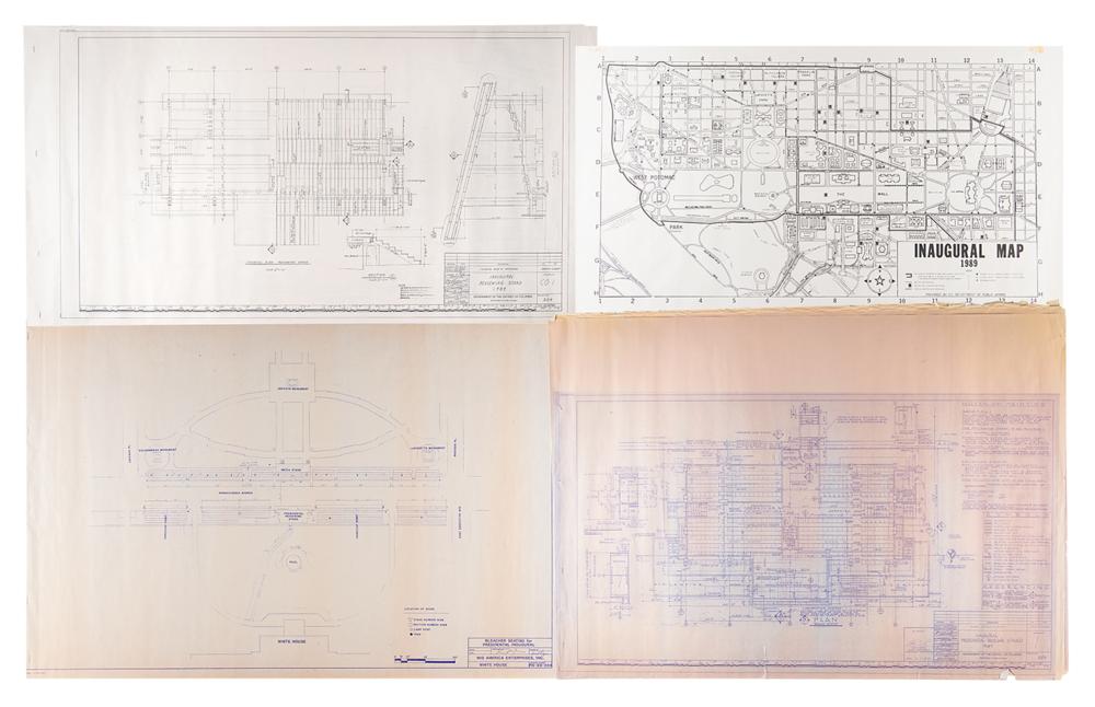 Set of original printed architectural plans and blueprints for the 1989 presidential inauguration of George Bush in Washington, D.C., totaling 17 sheets, ranging in size from 33 x 18 to 46 x 24, including: - eight large blueprints for the "Inaugural Reviewing Stand," including "plans, details, & notes," "front & west elevations," "rear elevation & details," "ceiling & pantry plans," "miscellaneous details," "presidential box details," "foundation plan," and "lighting & power plan." - four blueprints for "Bleacher Seating for the Presidential Inaugural." - four change order drawings for the "Inaugural Reviewing Stand." - an "Inaugural Map" prepared by the D.C. Department of Public Works. Rolled and in overall very good to fine condition, with some scattered creasing, and a few tears and losses to edges. A fascinating architectural lot offering behind-the-scenes insight into the meticulous, detail-oriented planning that goes into one of the United States' most dignified ceremonies.