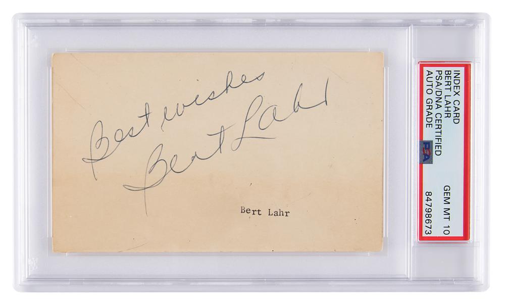 Vintage ballpoint signature of the Cowardly Lion actor, "Best wishes, Bert Lahr,” on an off-white 5 x 3 card. In fine condition. Encapsulated and graded by PSA/DNA as "GEM MT 10."