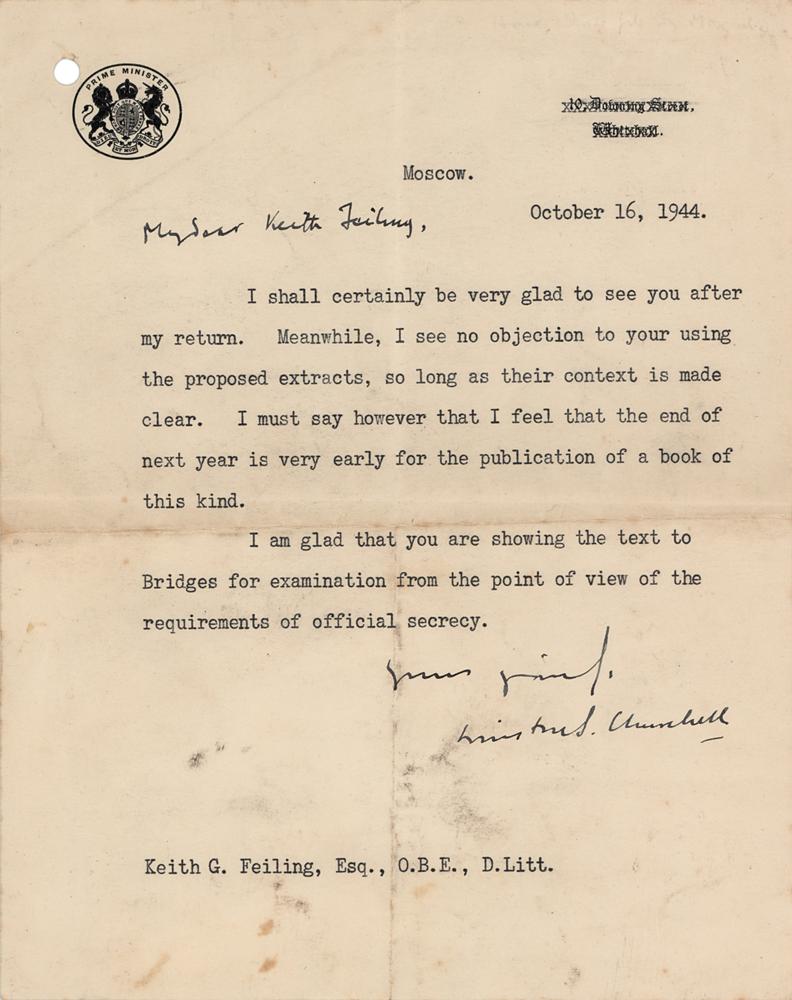 World War II-dated TLS, signed “Yours sincerely, Winston S. Churchill,” one page, 7.5 x 9.5, Prime Minister letterhead, October 16, 1944. Letter to British historian Keith G. Feiling, sent from Moscow during Churchill's meetings with Josef Stalin during World War II. In full: "I shall certainly be very glad to see you after my return. Meanwhile, I see no objection to your using the proposed extracts, so long as their context is made clear. I must say however that I feel that end of next year is very early for the publication of a book of this kind. I am glad that you are showing the text to Bridges for examination from the point of view of the requirements of official secrecy." In very good to fine condition, with scattered staining and soiling, and a light diagonal crease to the upper left corner. The work in question was probably Feiling's The Life of Neville Chamberlain, which would be published in 1946. From October 9-19, 1944, Churchill attended the 'Moscow Conference' in Russia, where he and Stalin discussed the division of postwar Europe into Western and Soviet spheres of influence. They agreed upon a secret 'percentages agreement'—famously outlined by Churchill on the back of a napkin—which ceded split authority over the eastern European nations between the Allied powers: for example, Romania would be under 90% Soviet influence and 10% Western influence; Greece would be 90% West and 10% Soviet; and Hungary would be split 50%-50%. The content of the agreement was first made public by Churchill in 1953 in the final volume of his memoir, The Second World War. A remarkable letter from a significant moment in history.