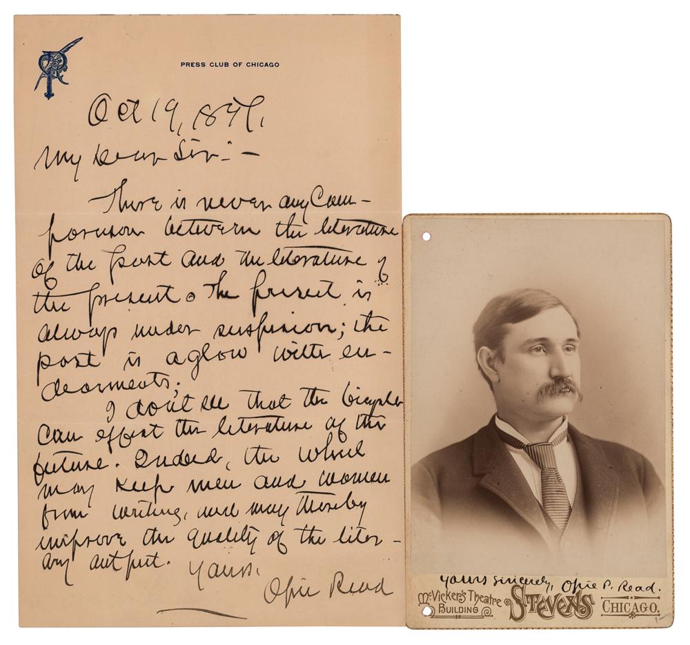 American journalist and humorist (1852-1939) credited with bringing the phrase 'There's a sucker born every minute' into print in his 1898 novel A Yankee from the West, although the phrase seems to have already been in verbal use and is often credited to P. T. Barnum. Two signed items: a 4.25 x 6.5 cabinet photo of Read by Stevens of Chicago, signed on the mount in ink, "Yours sincerely, Opie P. Read"; and an ALS signed "Opie Read," one page, 6 x 9.5, Press Club of Chicago letterhead, October 19, 1897, in part: "There is never any comparison between the literature of the past and the literature of the present. The present is always under suspicion; the past is aglow with endearments." In overall very good to fine condition, with two punch holes to the cabinet card.