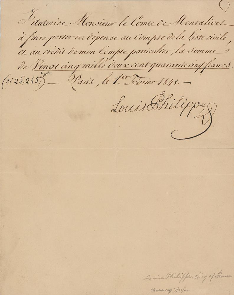 Last king of France (1773-1850) who reigned from 1830 until being forced to abdicate in 1848. Manuscript DS in French, signed “Louis Philippe,” one page, 7.75 x 10, February 1, 1848. Untranslated document issued by King Louis Philippe in the days prior to his abdication, granting a credit of the sum of 25,245 francs. In fine condition, with small edge separations to intersecting folds (one reinforced with old tape to reverse) and a rusty circular paperclip impression to the upper right corner