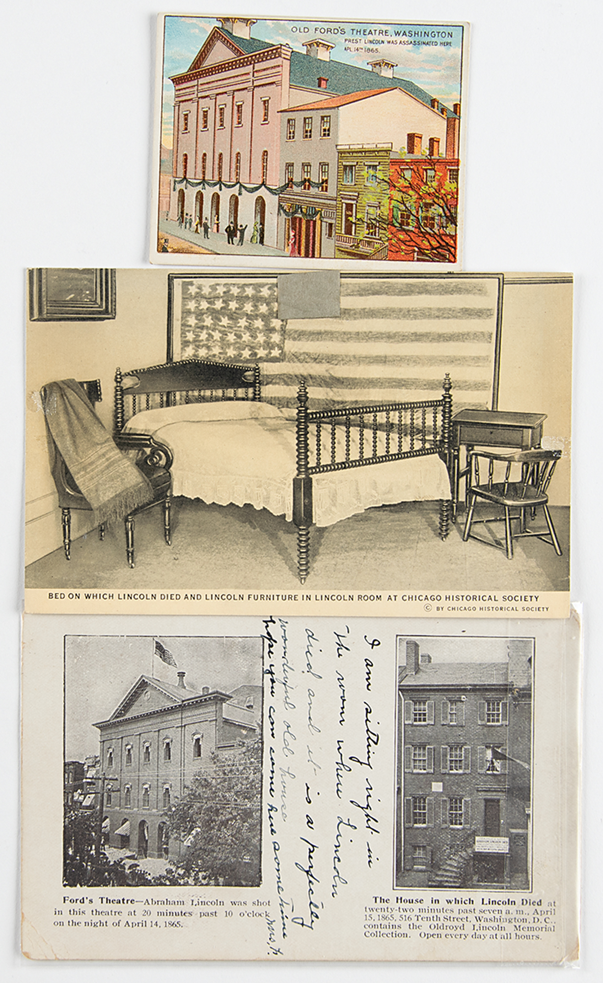 Ephemera affiliated with Ford's Theatre, where President Abraham Lincoln was shot on April 14, 1865, during a performance of Our American Cousin. The highlights are: a 1910 T108 'Between the Acts' tobacco card of Ford's Theatre; a vintage postcard of Ford's Theatre and the Petersen House, postmarked 1922, annotated at the center: "I am sitting right in the room where Lincoln died and it is a perfectly wonderful old house. Hope you can come here sometime"; and a vintage Chicago Historical Society postcard depicting the "bed on which Lindon died and Lincoln furniture in Lincoln Room at Chicago Historical Society."